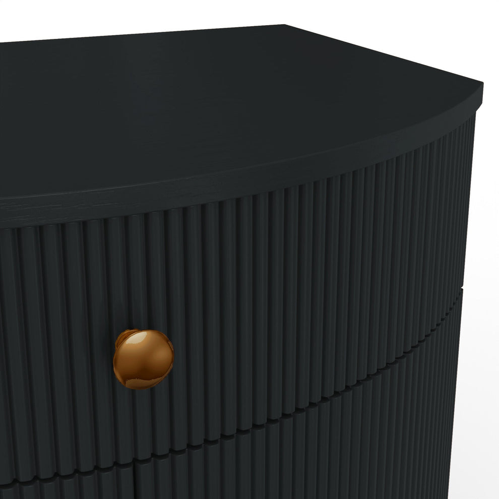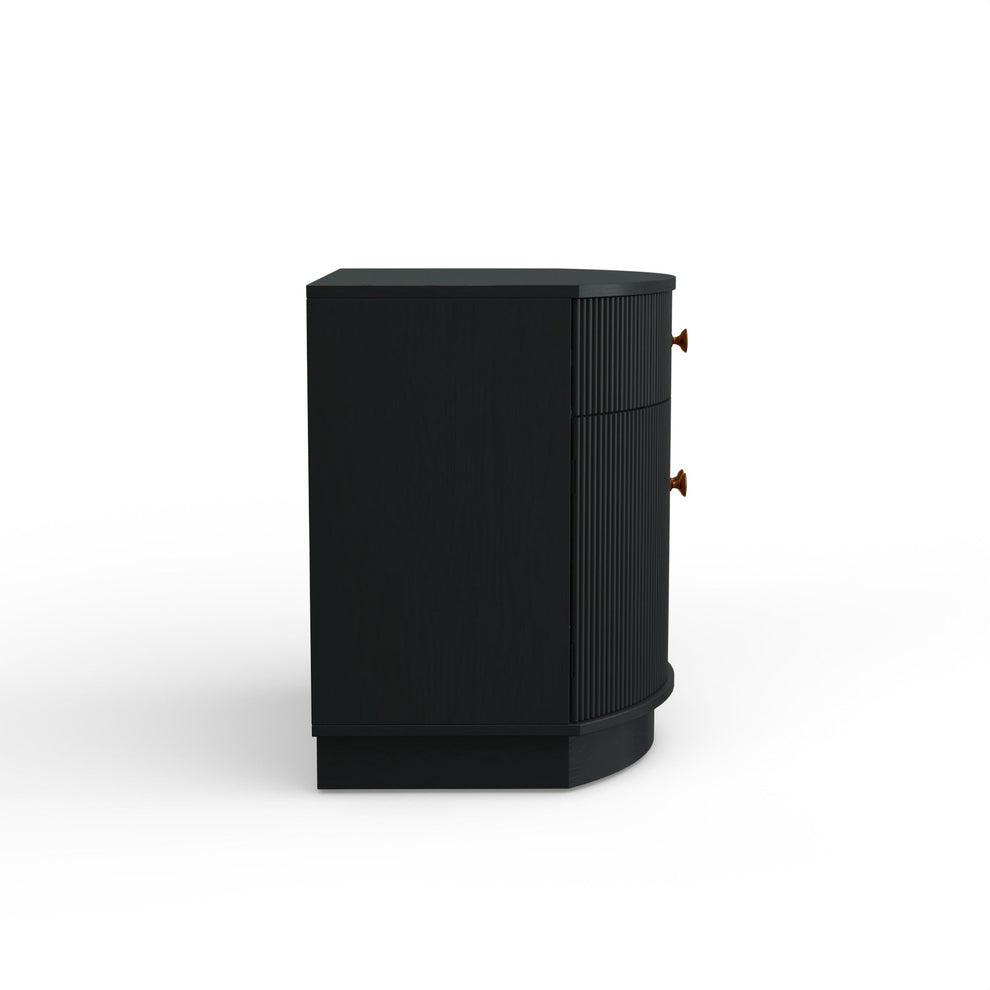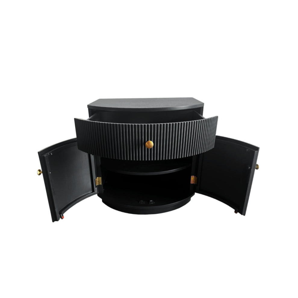 Elevate your bedroom with the captivating Avery Nightstand, where modern design meets practical elegance. Its graceful curves, ribbed drawer and door fronts with subtle wood texture, and chic brass finish knobs create sophisticated charm. Featuring ample storage with a spacious drawer and an interior shelf, the Olivia Nightstand is a striking centerpiece blending form and function beautifully.