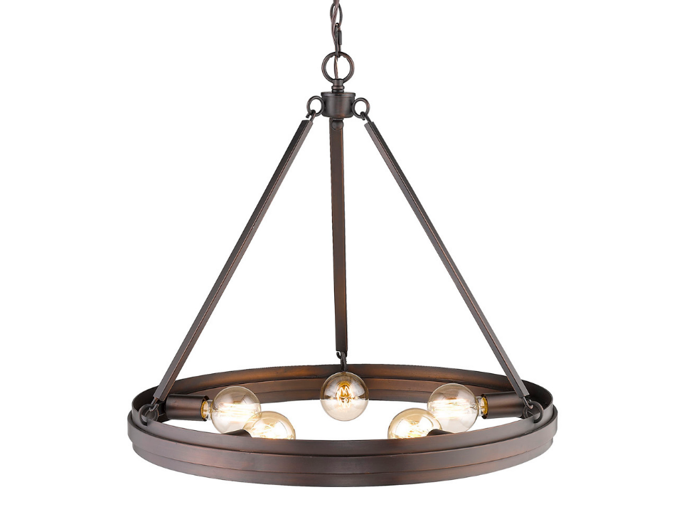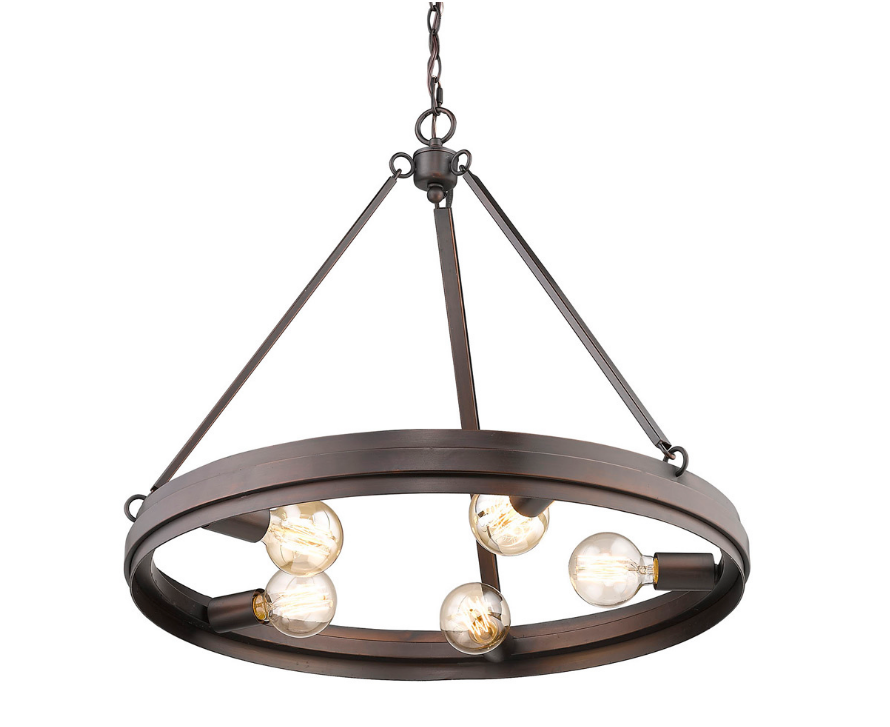 The hand-painted Rubbed Bronze finish of the Berry chandelier pairs perfectly with industrial-inspired décors. Casual, yet sophisticated, this simple, modern design is effortless. 5 medium-base bulbs horizontally sit inside a round hoop. Add Edison bulbs for a vintage feel that is perfect for farmhouse and industrial decors. This 5-light chandelier is perfect for illuminating a dining room, family room, or kitchen.
