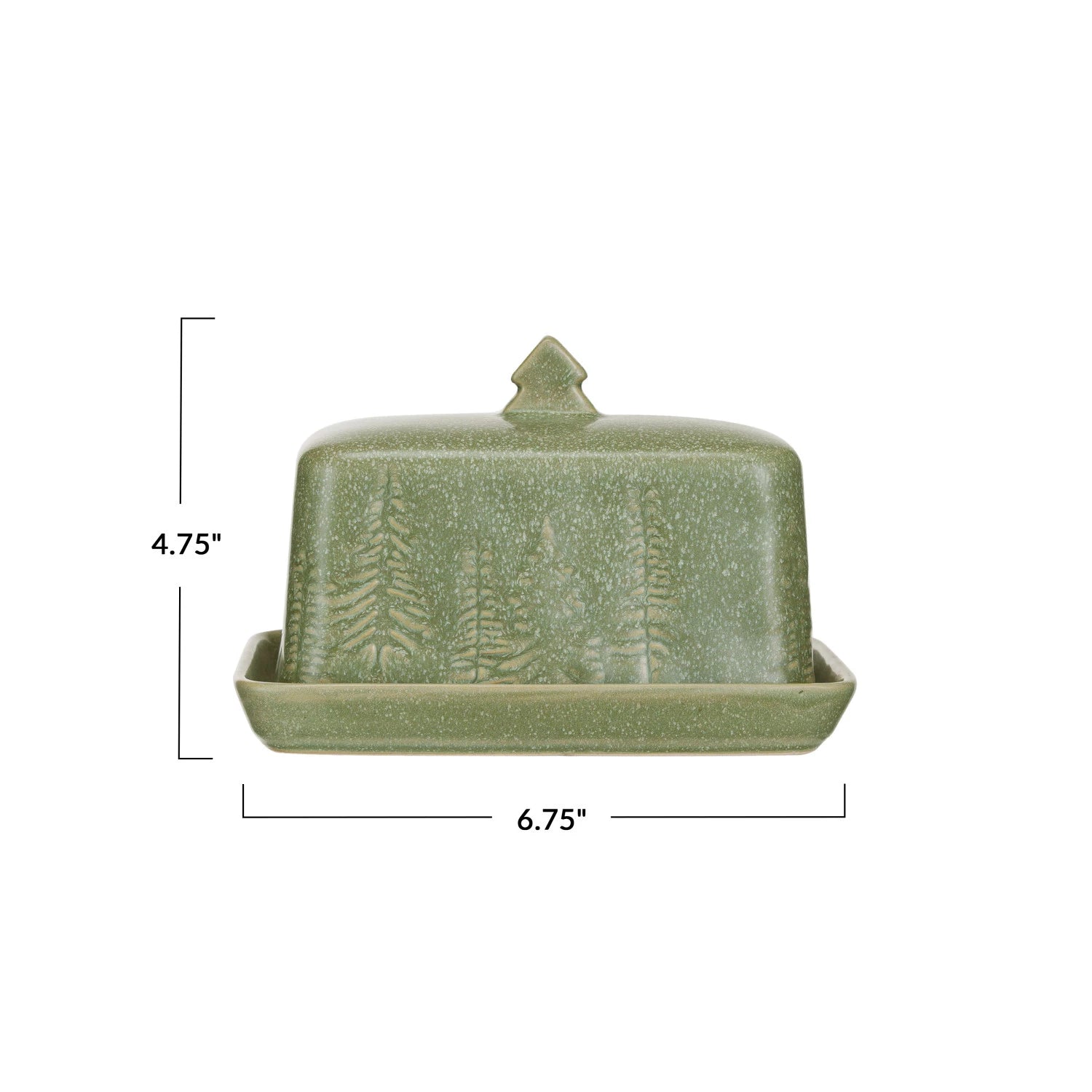 6-3/4"L x 4-1/4"W x 4-3/4"H Debossed Stoneware Butter Dish w/ Trees, Matte Reactive Glaze, Green (Each One Will Vary)