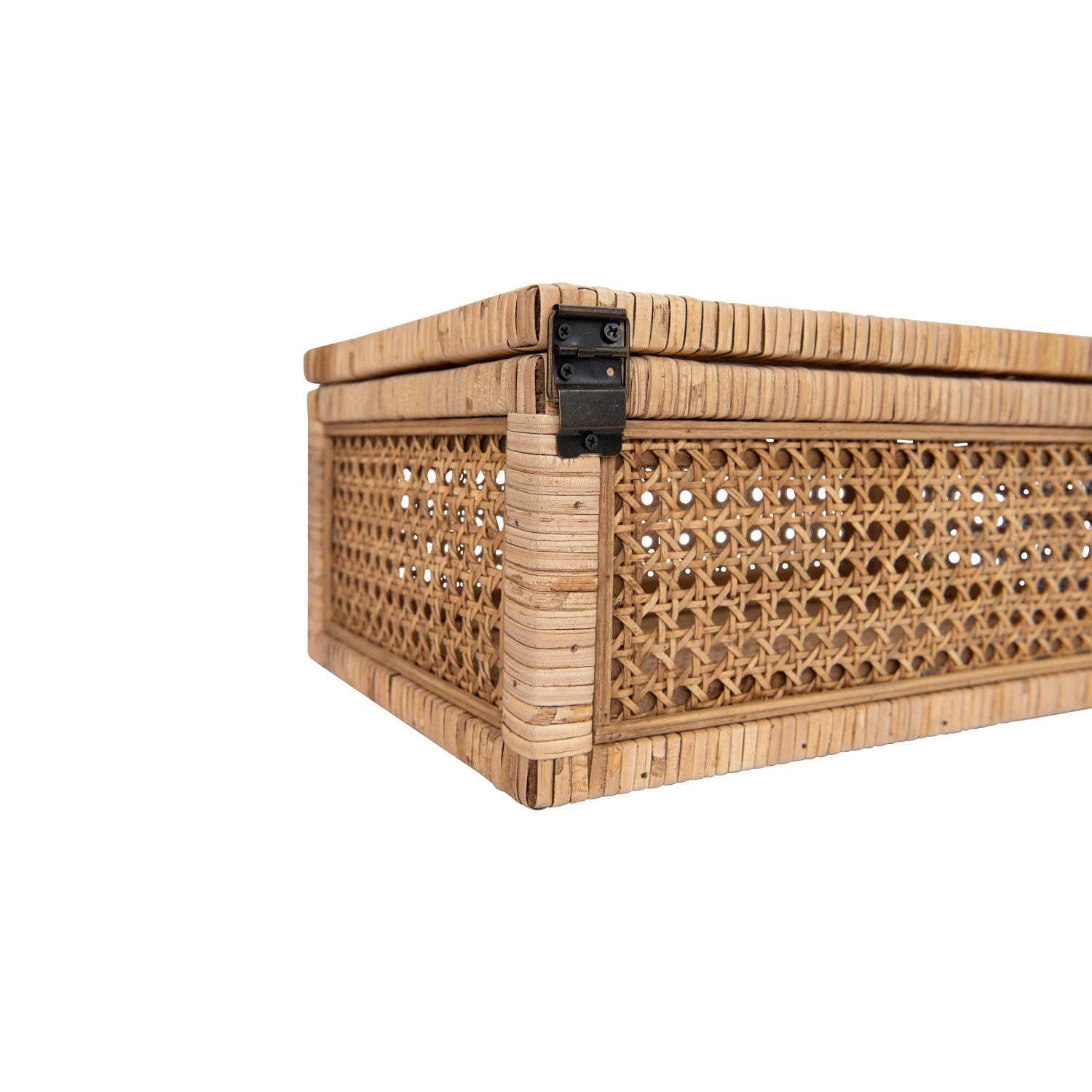Clear glass on the lids allow the contents of each container to be seen without opening. These amazing rattan boxes are perfect for storing items on the dresser or any shelf. They can also be stood upright with something special displayed inside.