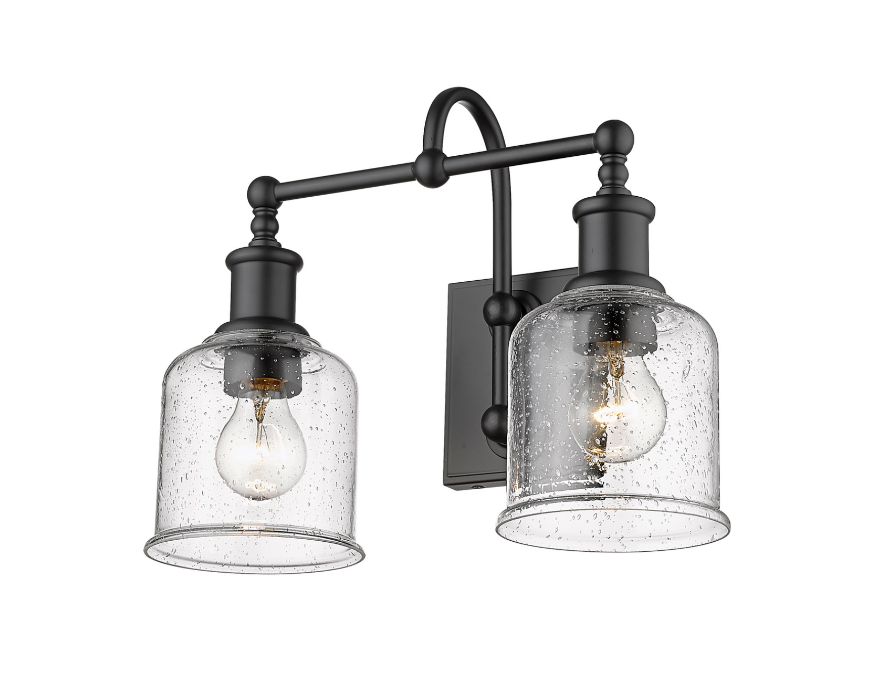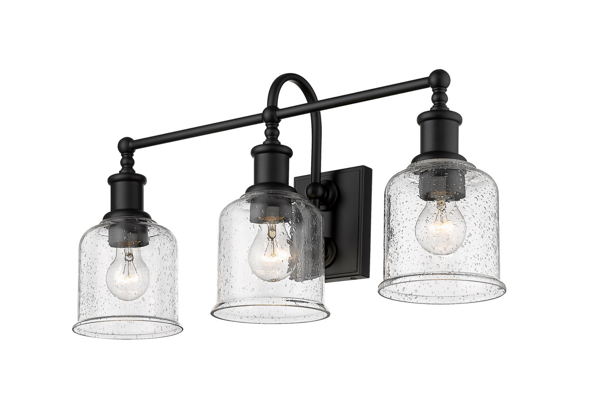 Choose a vintage industrial look with nautical influence, adding this matte blaxk vanity light from the Elsie collection. Embrace a bold matte black steel frame and mount, blending beautifully with clear seedy glass shades. A curved arm, ornate holders, and lipped shades generate extra charm that stylize a custom bath space, dining area, or main living room. Available in 2,3,4,5 light options