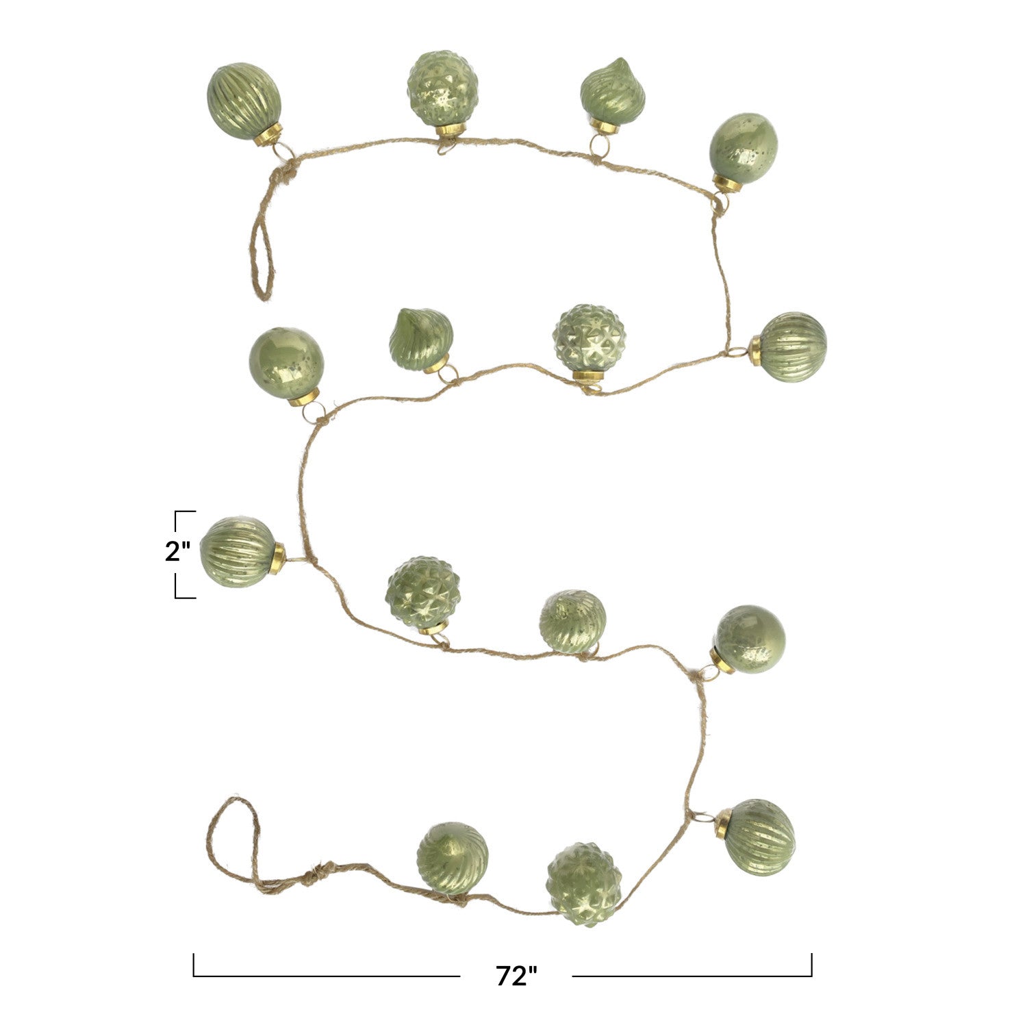 This embossed mercury glass ornament garland, draped on a jute cord, presents a series of olive green baubles that bring a refined aesthetic to any space. The embossed detail on each glass ornament catches the light, creating a subtle yet captivating display. At 72 inches long, the garland is substantial enough to make a statement, whether it's enhancing a holiday scene or adding a dash of elegance to year-round decor. Its combination of glass and metal ensures that this garland will remain a cherished part of the decorations for seasons to come. This is a perfect choice for anyone who loves graceful and elegant home decor. An elegant garland featuring green embossed mercury glass ornaments, strung on a natural jute cord. An opulent adornment, it's perfect for adding a touch of sophistication to any festive or everyday decor. Ideal for creating a focal point along mantels, doorways, or as a chic centerpiece for tables.