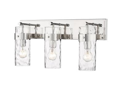 Equal parts stylish and functional, this three-light vanity fixture is alluring. The cylindrical glass shade is accented with a ripple texture in a romantic design. Steel construction in a polished nickel finish allows it to pair with many types of decor ranging from farmhouse to modern.