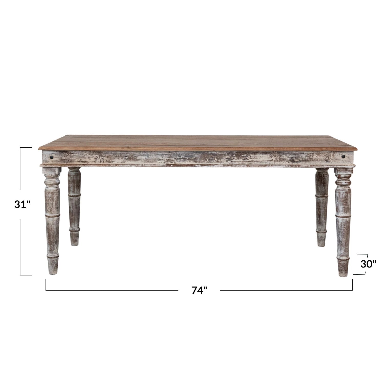 This Whitewashed Reclaimed Wood Dining Table stands as a testament to the beauty of restoration and repurpose. The table, stretching 74.0 inches long and 30.0 inches wide, rises to a height of 31.0 inches, making it an imposing yet inviting presence in any dining area. Its surface, treated with a delicate whitewash, reveals the unique patterns and imperfections of reclaimed wood, each telling a tale of its past life. Supported by a metal base, the table promises durability and a firm foundation for gatherings of all kinds. Designed to blend with farmhouse, rustic, or reclaimed decor styles, it's not just a dining table—it's a centerpiece that brings history and character to the home.