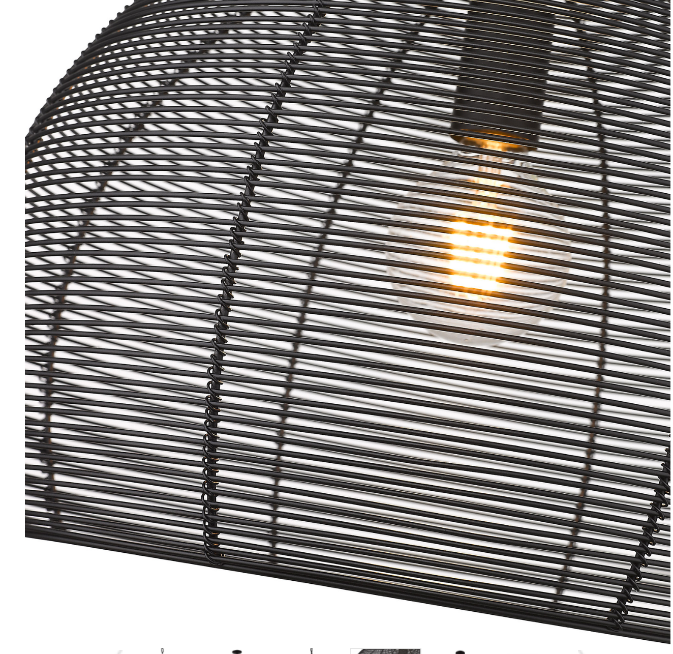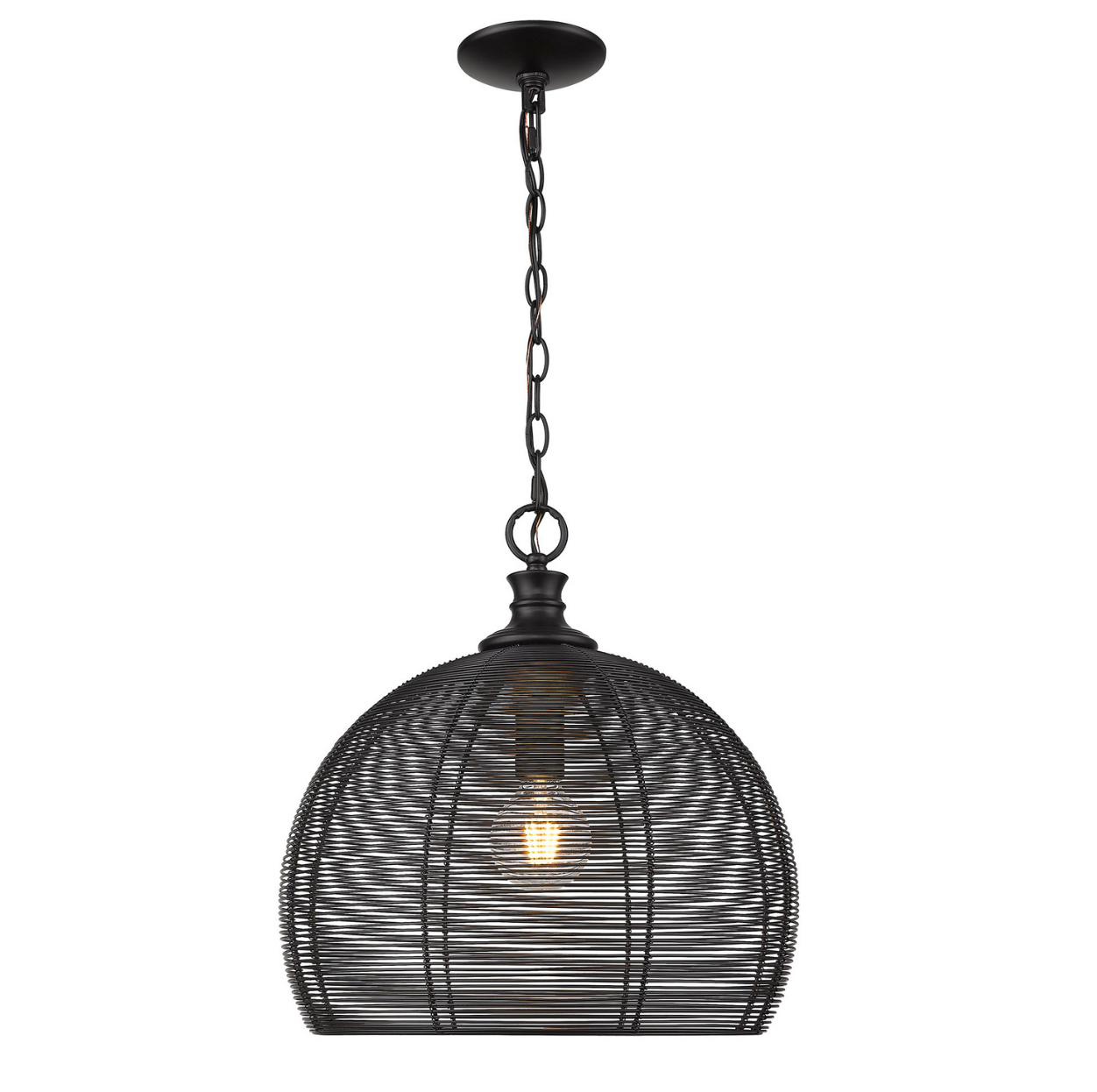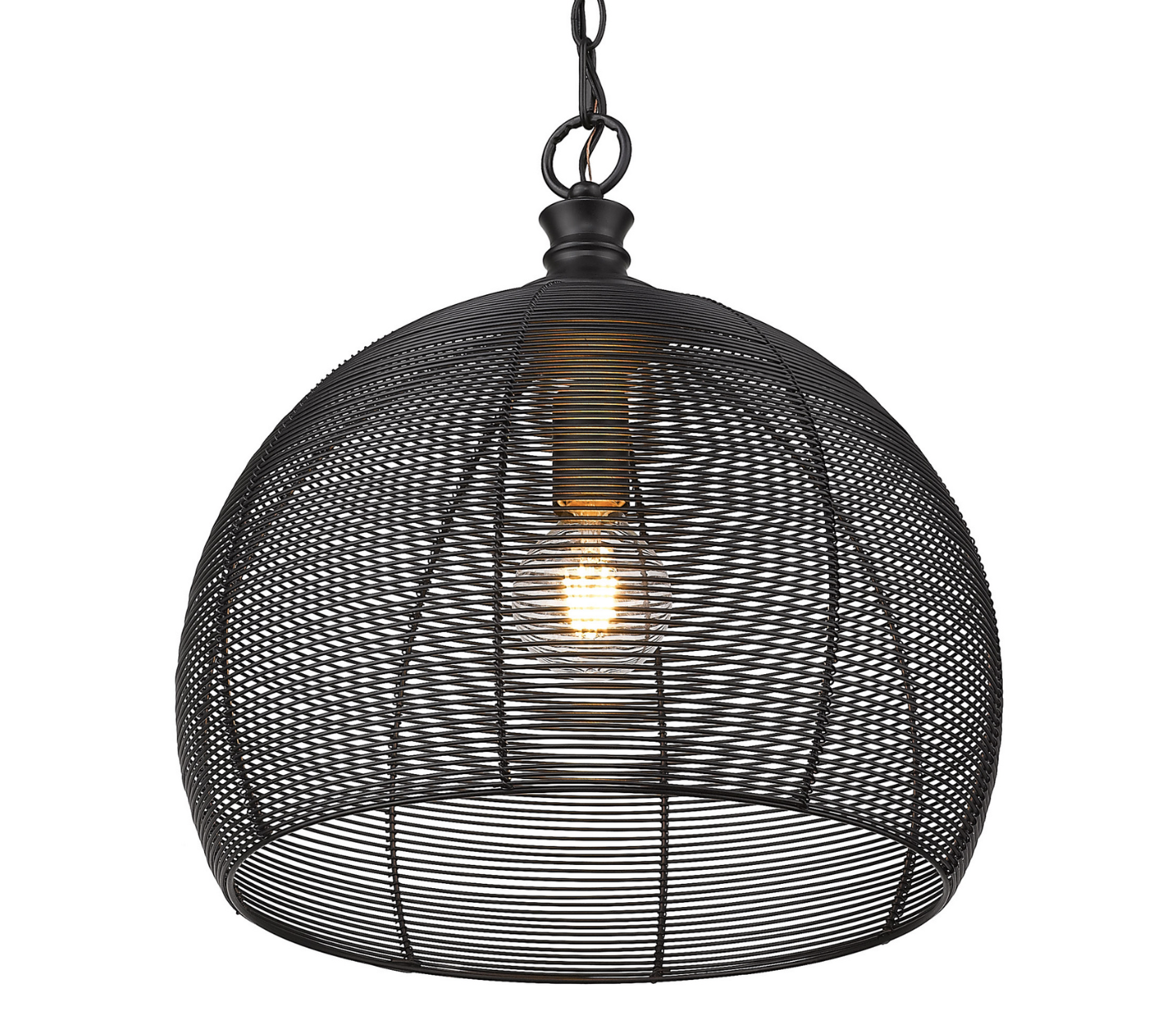 The Hayven collection lends a modern, feminine tone wherever it hangs. The visual effect of the tightly wrapped wires of the dome shade, fitted one above another without overlap, draws the eye. The gaps in the matte black shade offer partial views of a simple lamp. When lit within the wound wires, a bright bulb has a diffused affect. This jewelry-inspired decorative pendant can be used alone arrayed in a group over a large kitchen island.