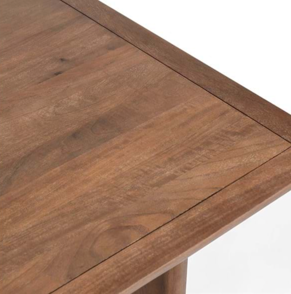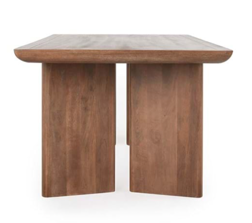The Lena is a solid mango wood dining table with soft curved legs. The warm medium brown stain perfectly shows off the dimensions of the beautiful wood grain.