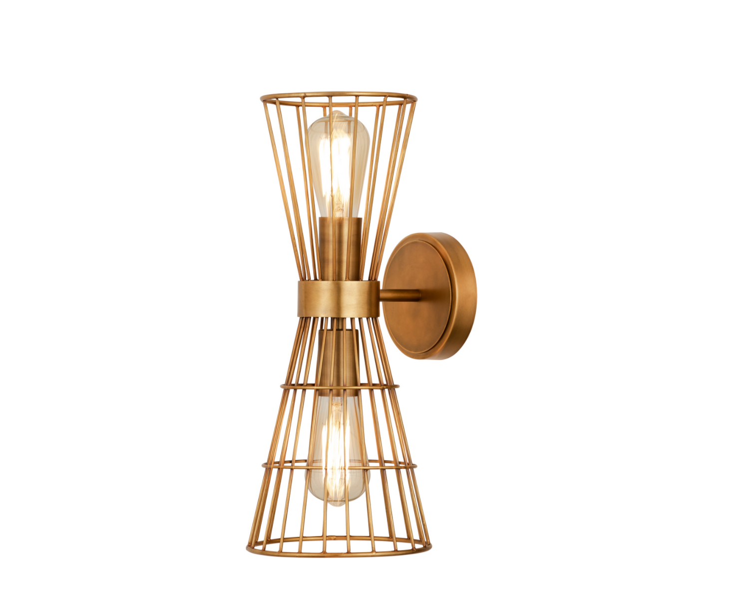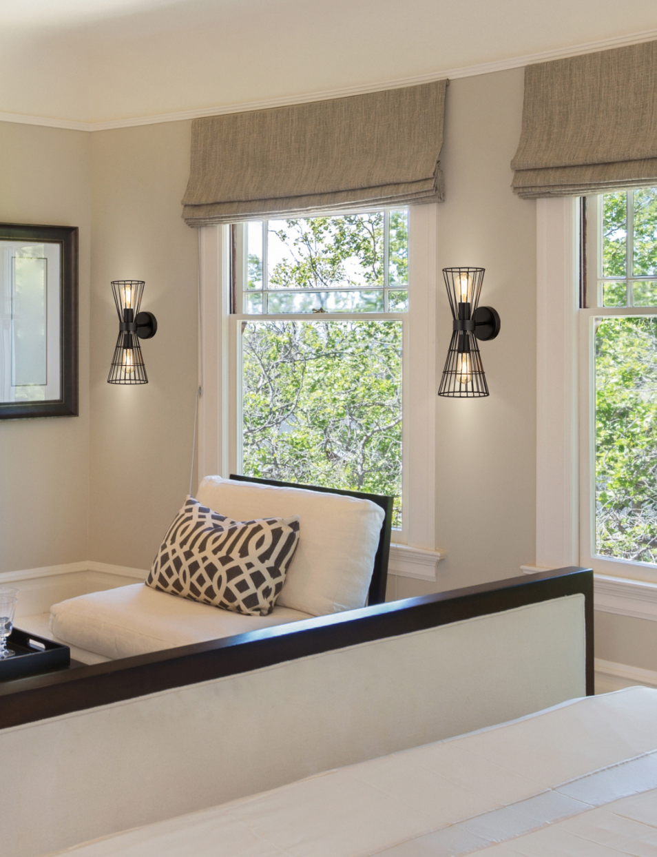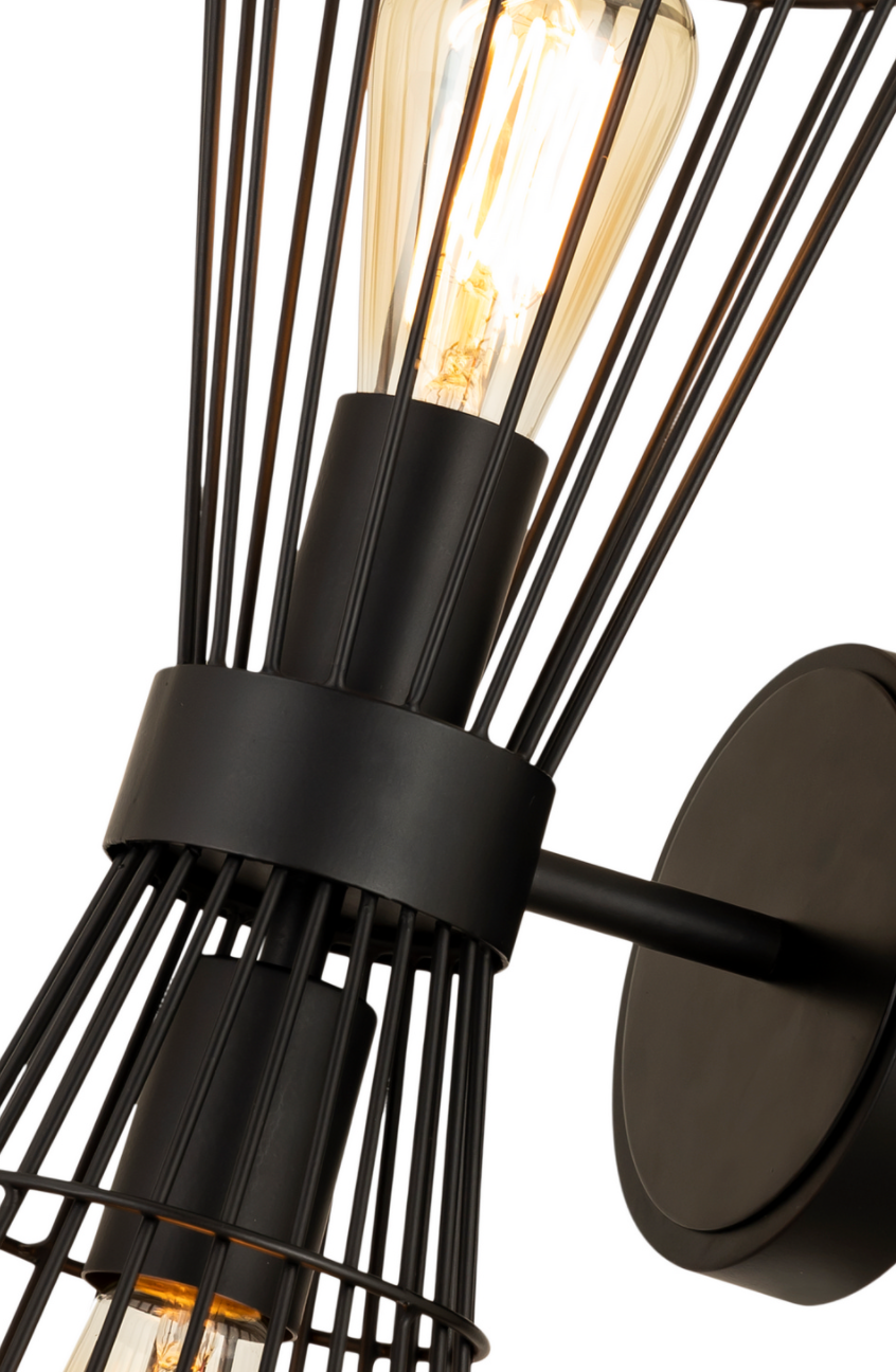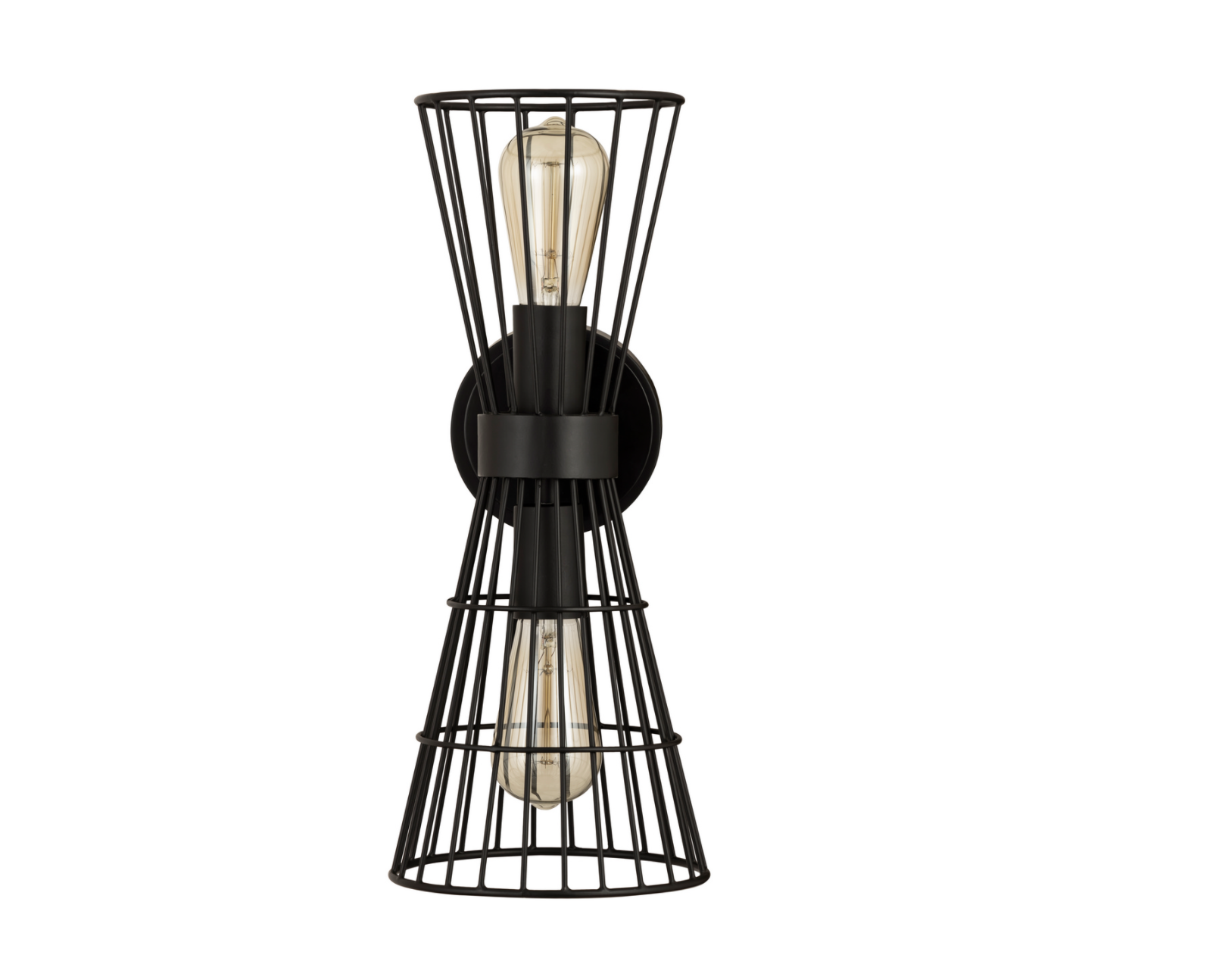 A cage-like design offers a hint of industrial inspiration to this energizing two-light wall sconce, a superb choice for a custom casual space. Light up a hallway, bathroom, or bedroom with this sconce offering geometric elegance in a concave silhouette and thin wires made of iron. Adding separately purchased vintage style bulbs changes up its motif to reflect versatility.