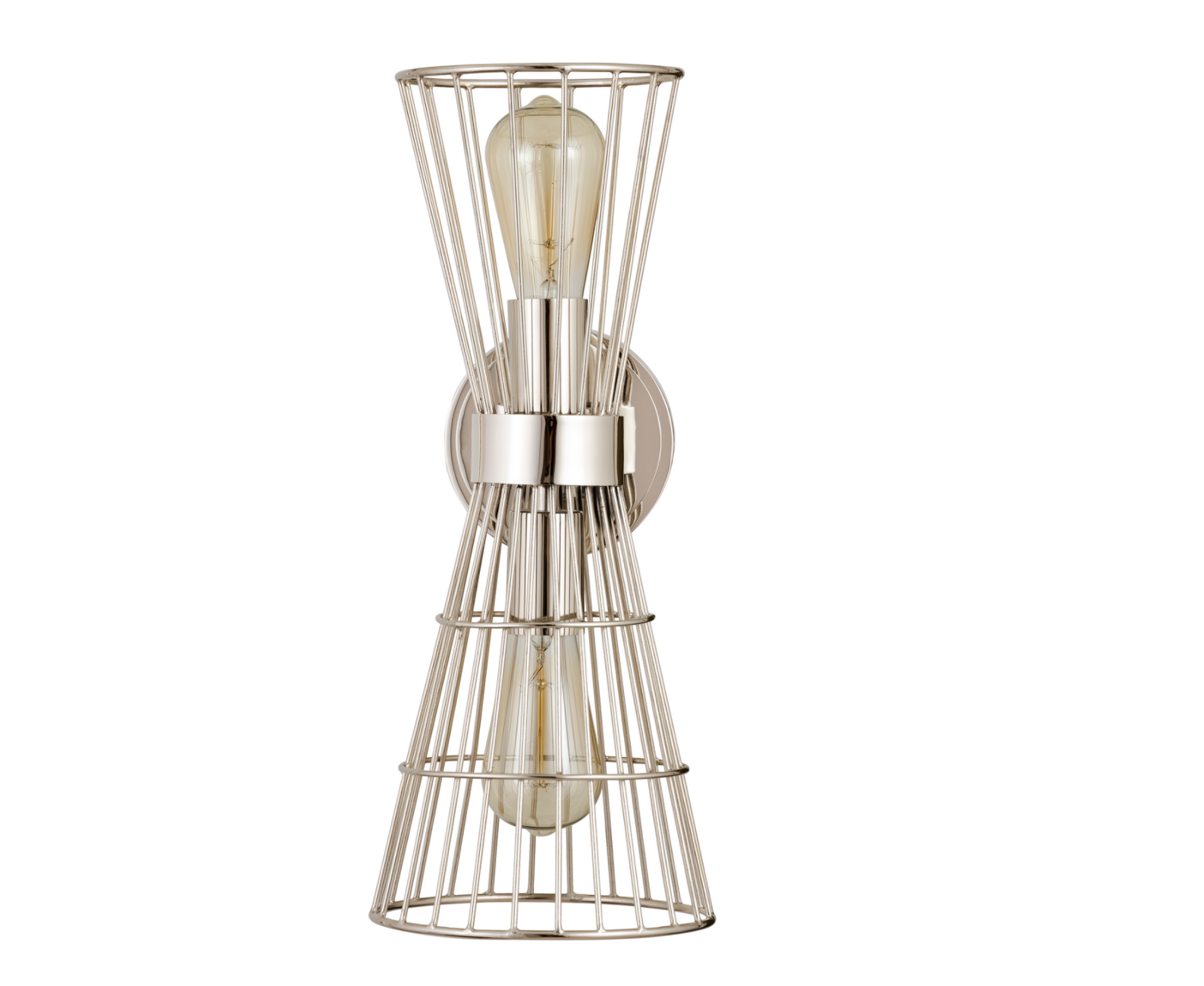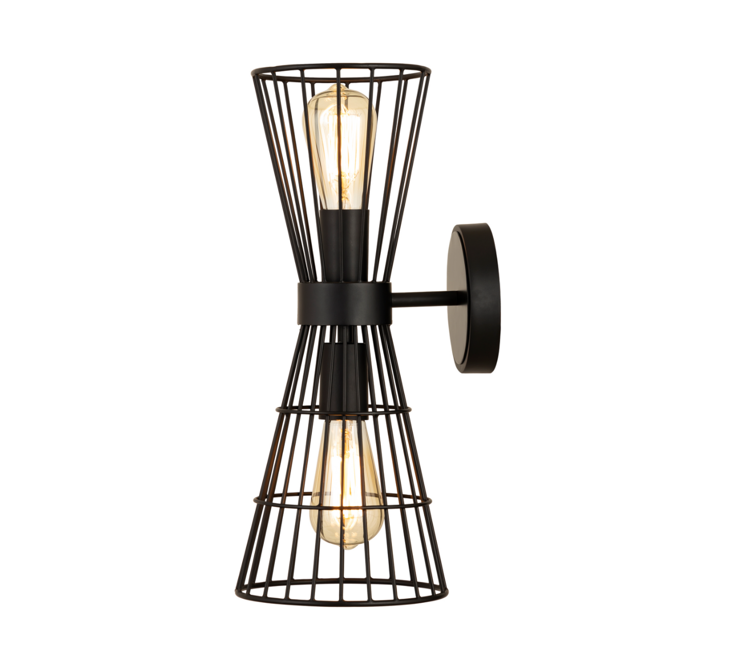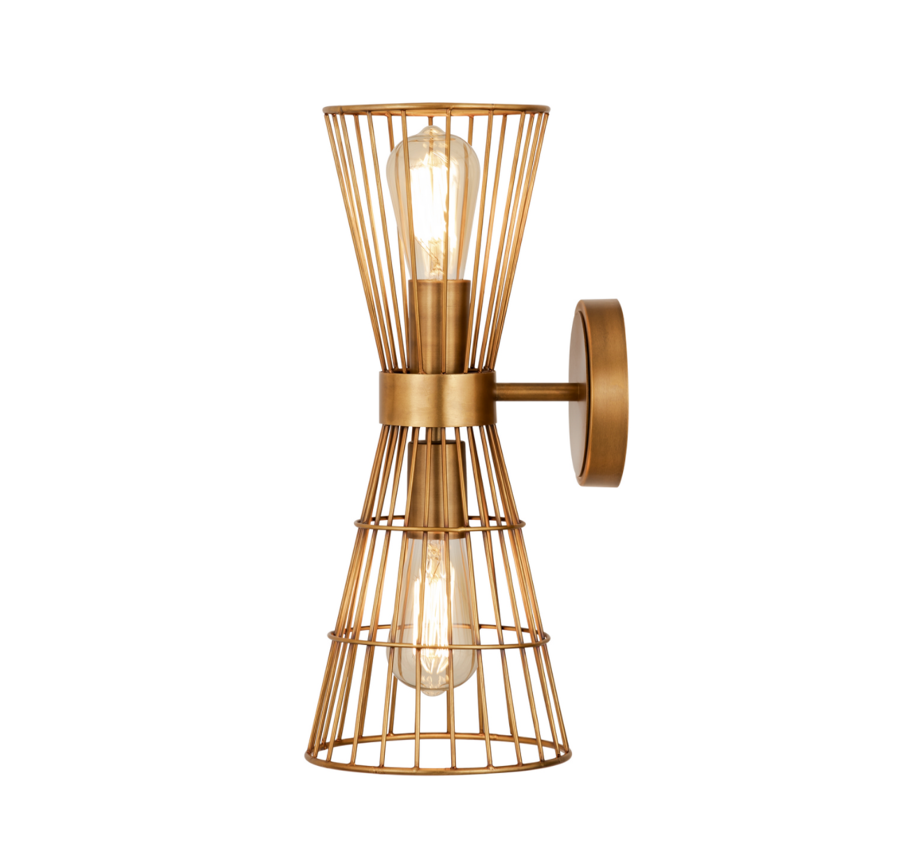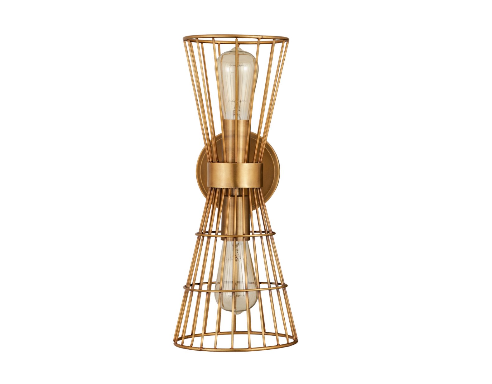 A cage-like design offers a hint of industrial inspiration to this energizing two-light wall sconce, a superb choice for a custom casual space. Light up a hallway, bathroom, or bedroom with this sconce offering geometric elegance in a concave silhouette and thin wires made of iron. Adding separately purchased vintage style bulbs changes up its motif to reflect versatility.