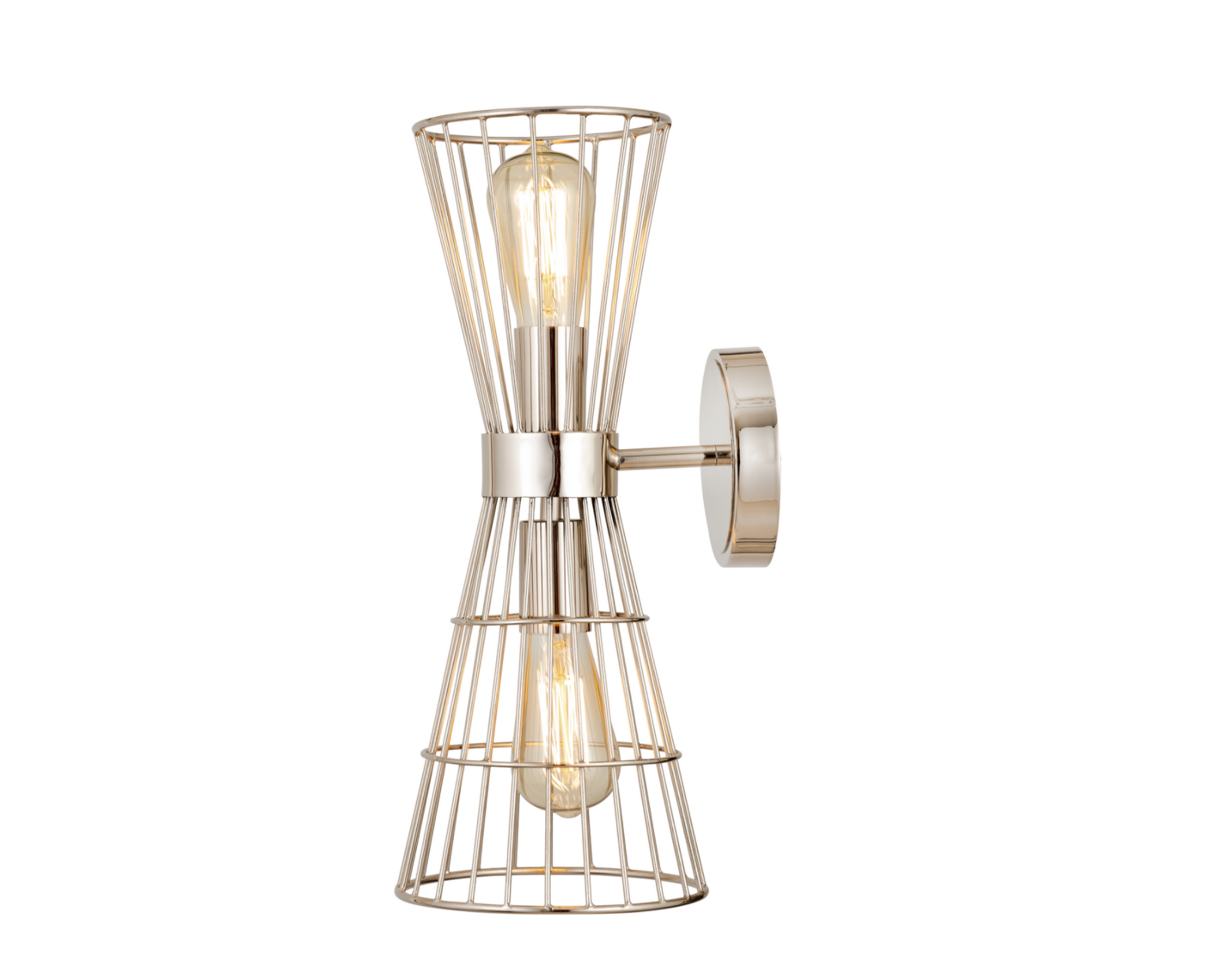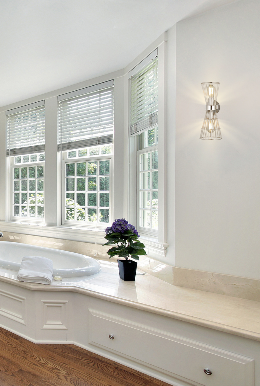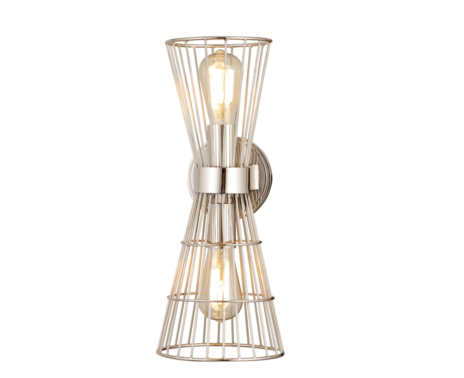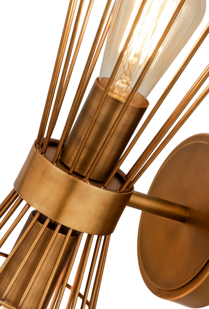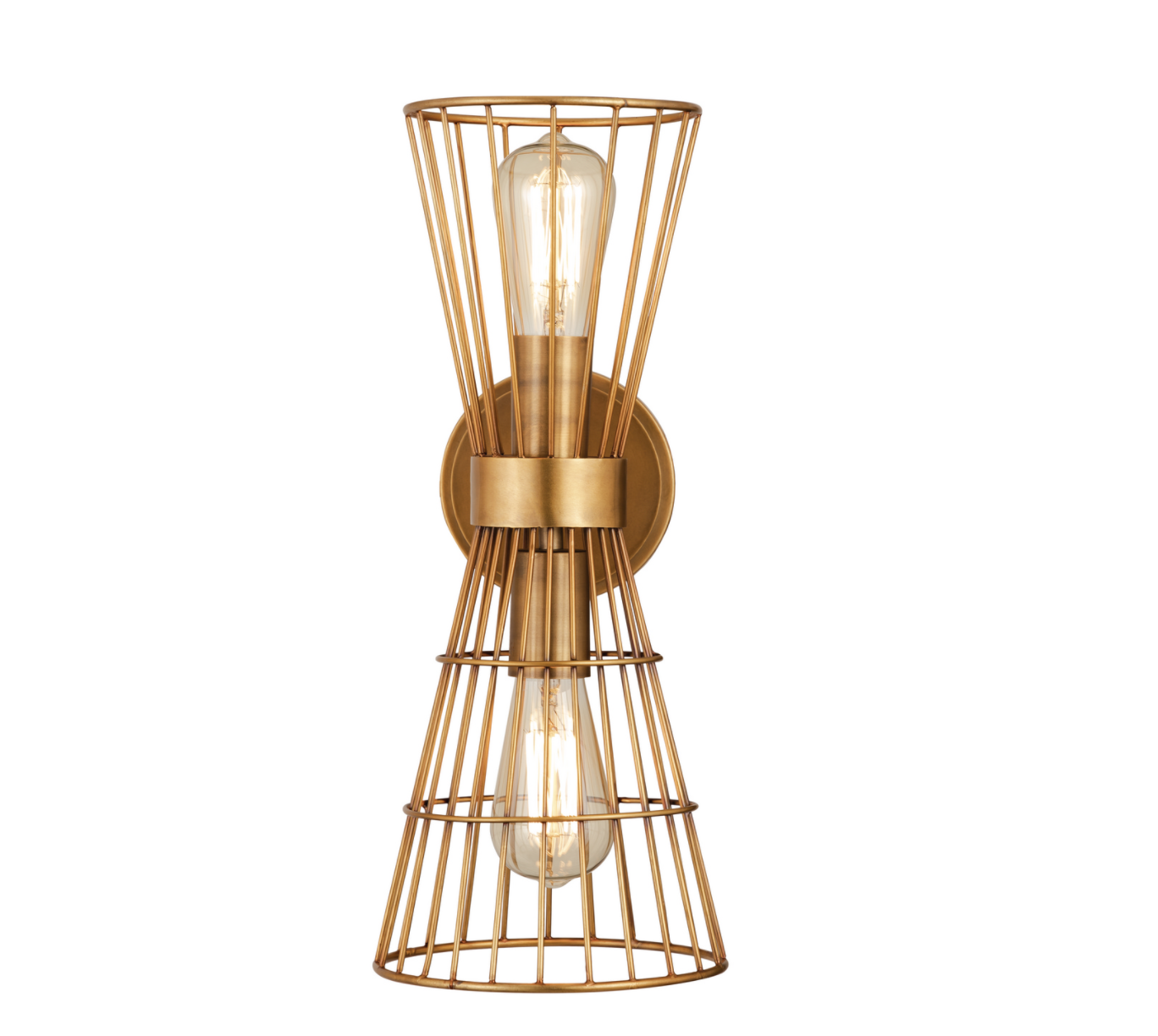 A cage-like design offers a hint of industrial inspiration to this energizing two-light wall sconce, a superb choice for a custom casual space. Light up a hallway, bathroom, or bedroom with this sconce offering geometric elegance in a concave silhouette and thin wires made of iron. Adding separately purchased vintage style bulbs changes up its motif to reflect versatility.