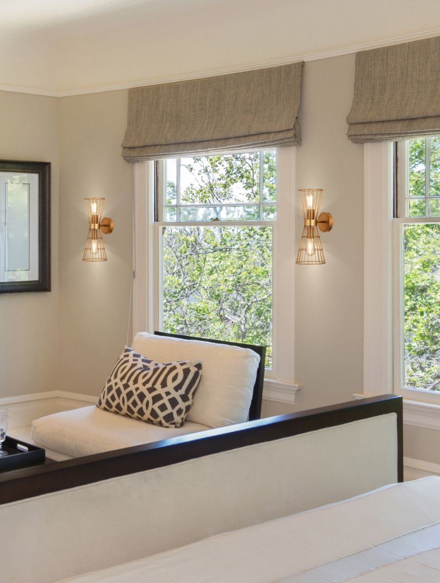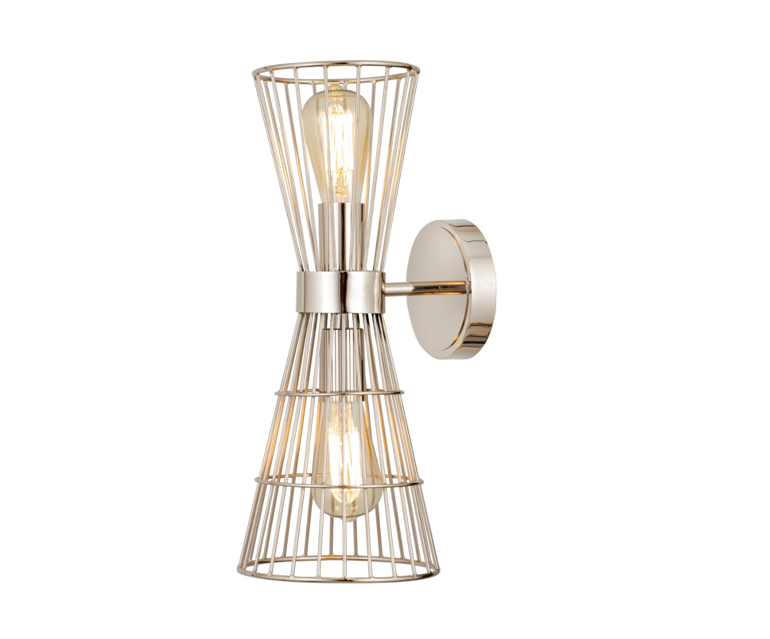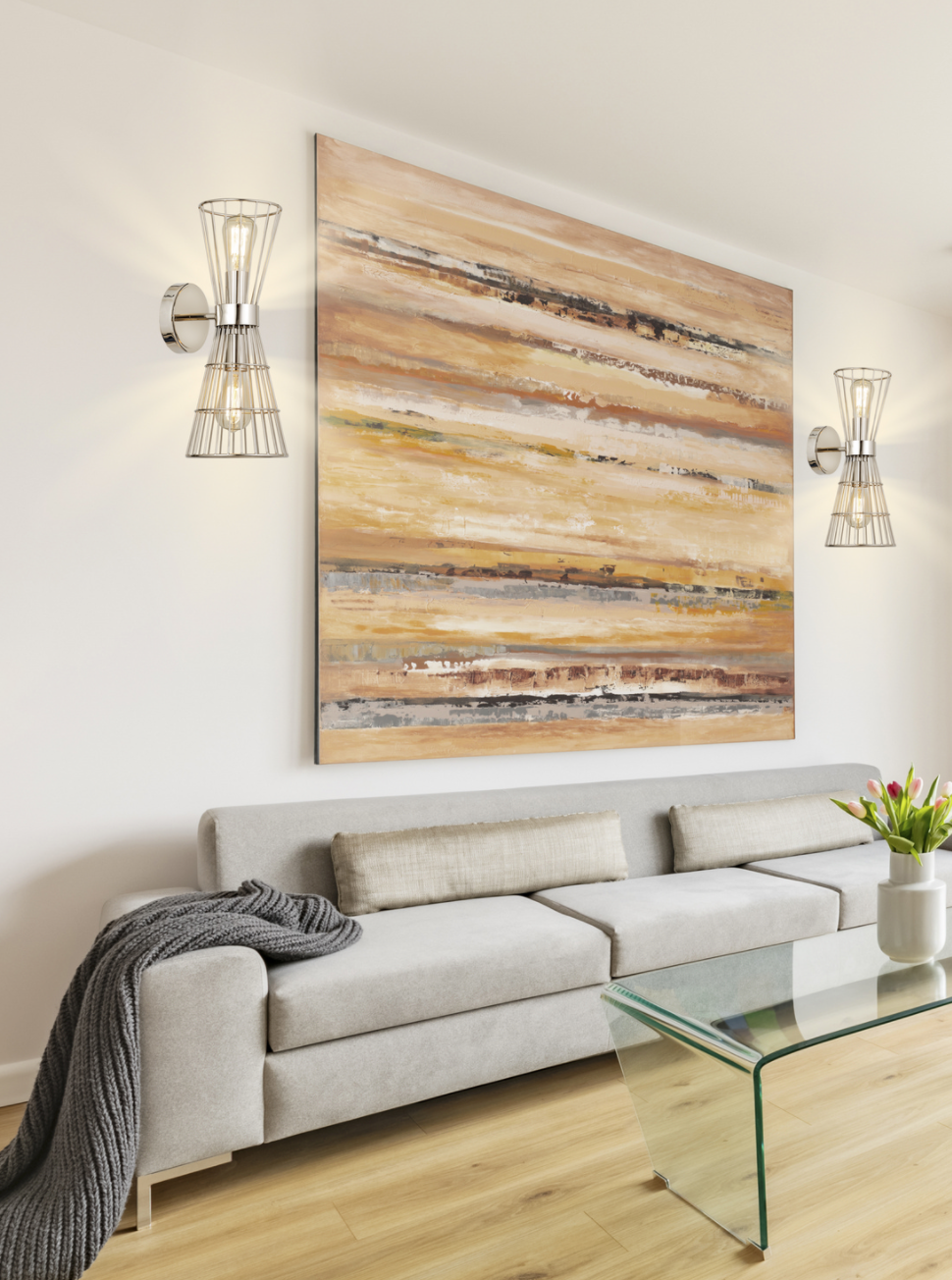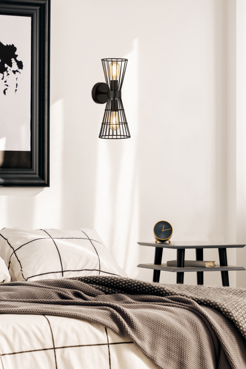 A cage-like design offers a hint of industrial inspiration to this energizing two-light wall sconce, a superb choice for a custom casual space. Light up a hallway, bathroom, or bedroom with this sconce offering geometric elegance in a concave silhouette and thin wires made of iron. Adding separately purchased vintage style bulbs changes up its motif to reflect versatility.