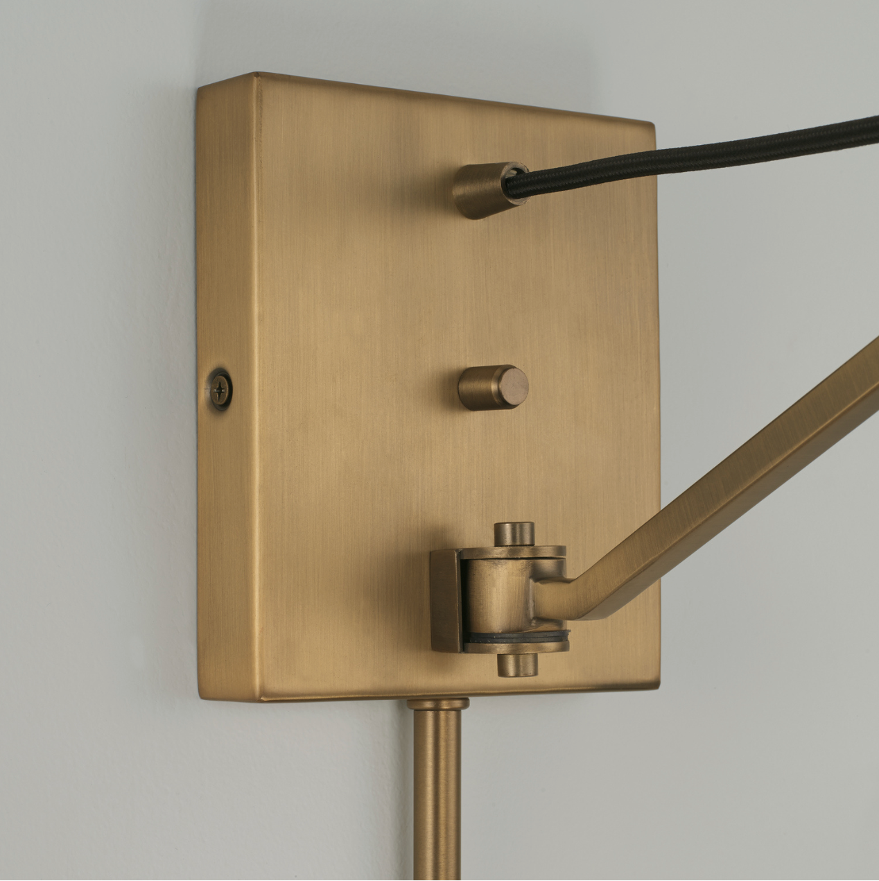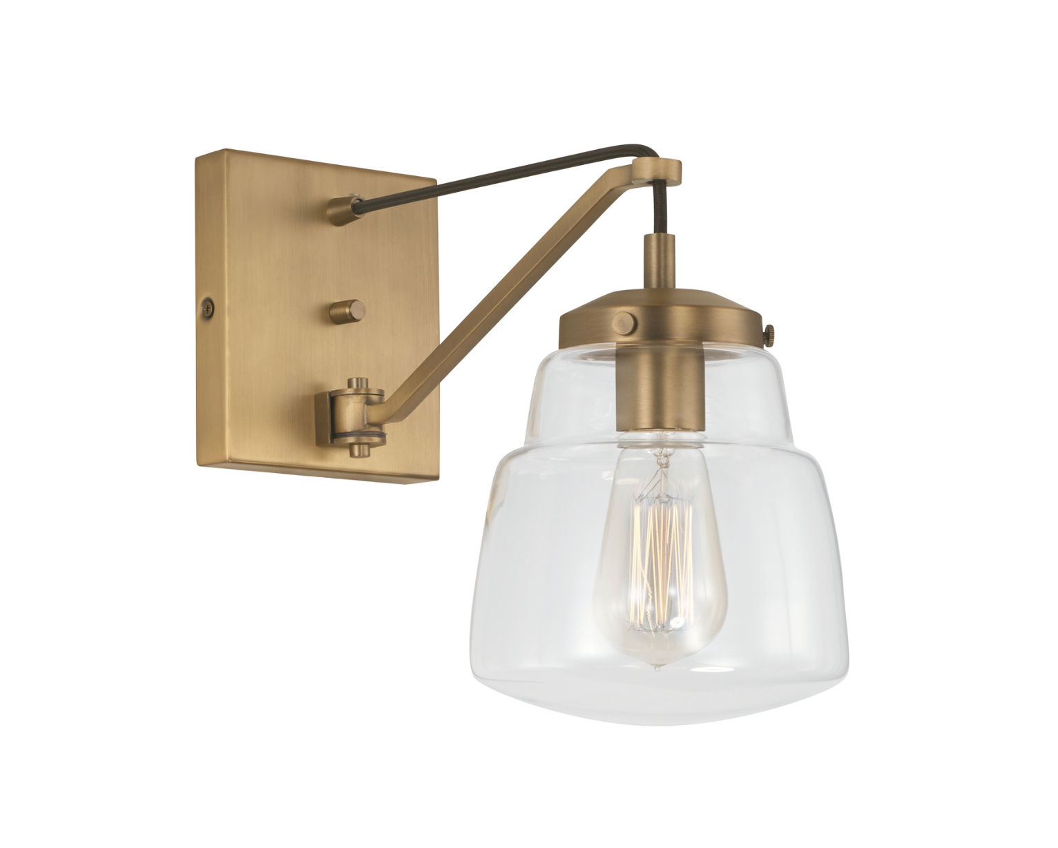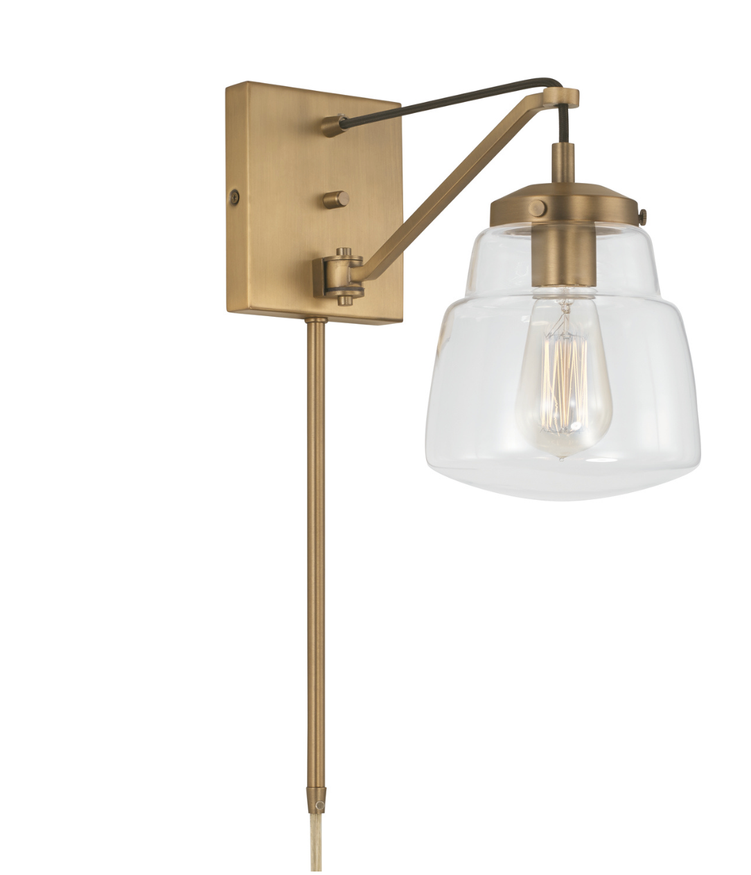 With a fresh spin on diner-inspired glass, the Macklin 1-Light Sconce brings a refined retro vibe to any space. The Aged Brass finish accents the pronounced rivet details and sculptural silhouette of the plug-in optional fixture.