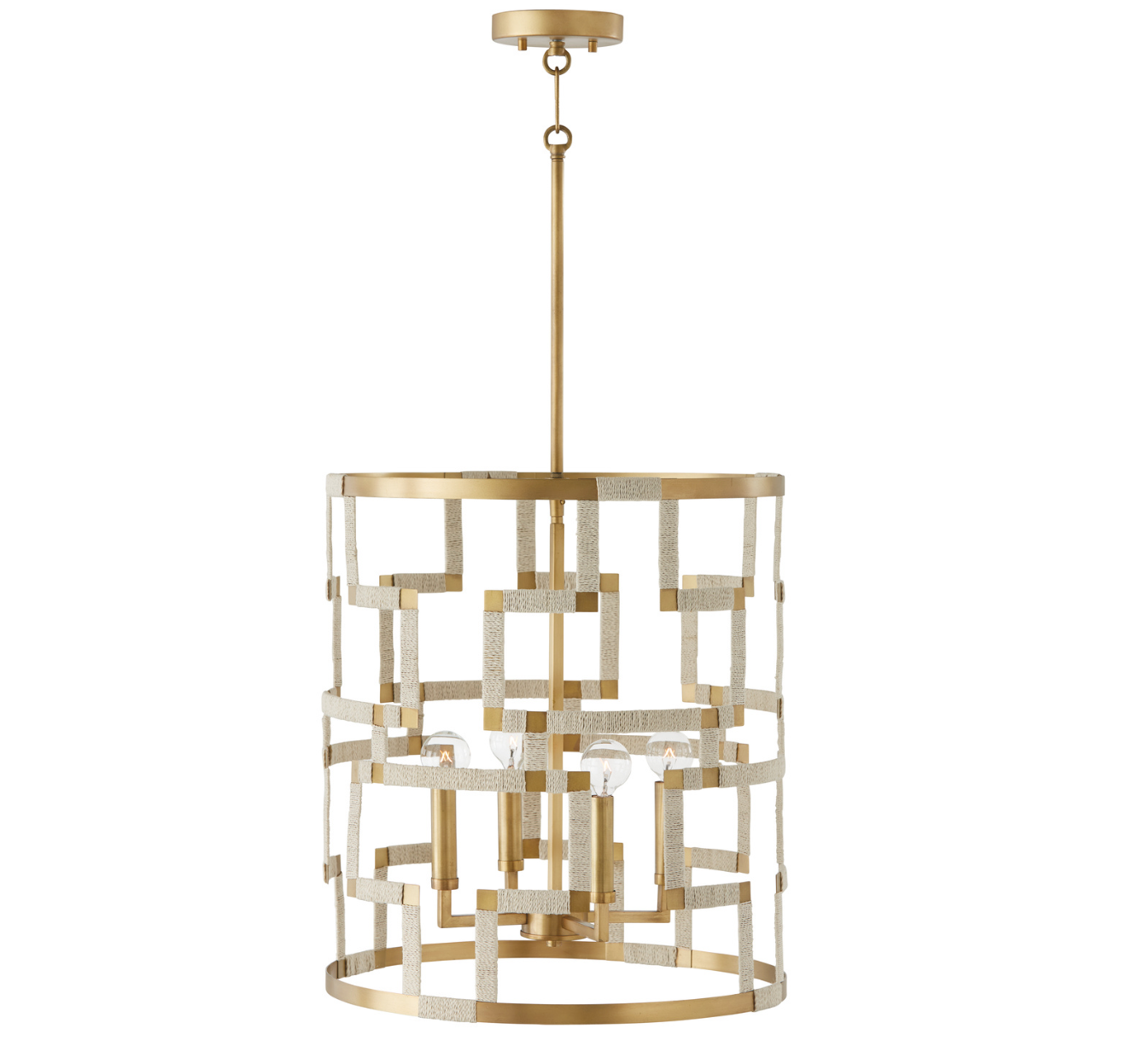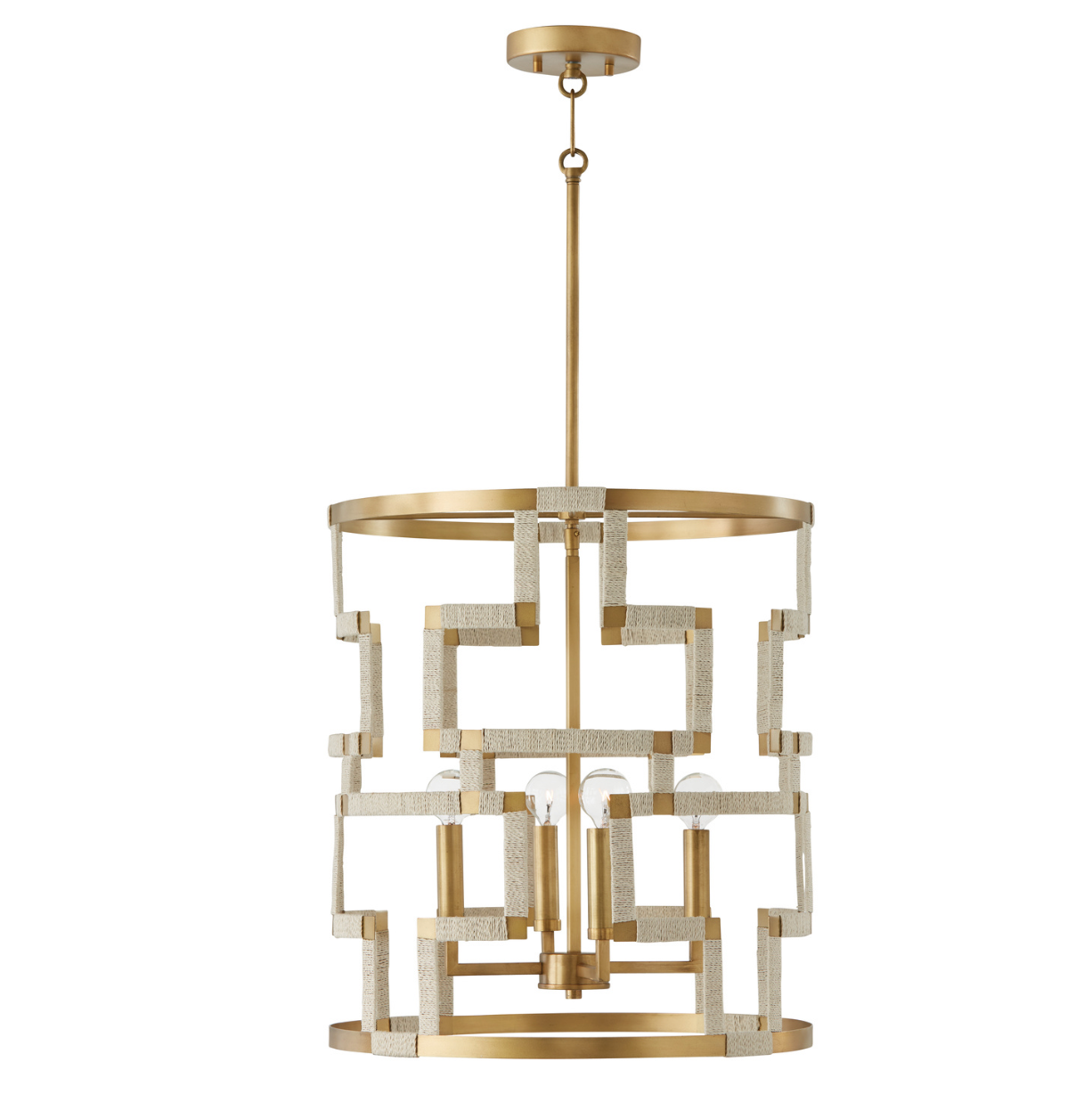 Naturally and graphically bold, the Nala 4-Light Foyer commands attention with its striking patternwork. The hand-applied patina on the unique brass finish accentuates the Greek key inspired design, while the bleached natural jute rope softens the sharp edges.
