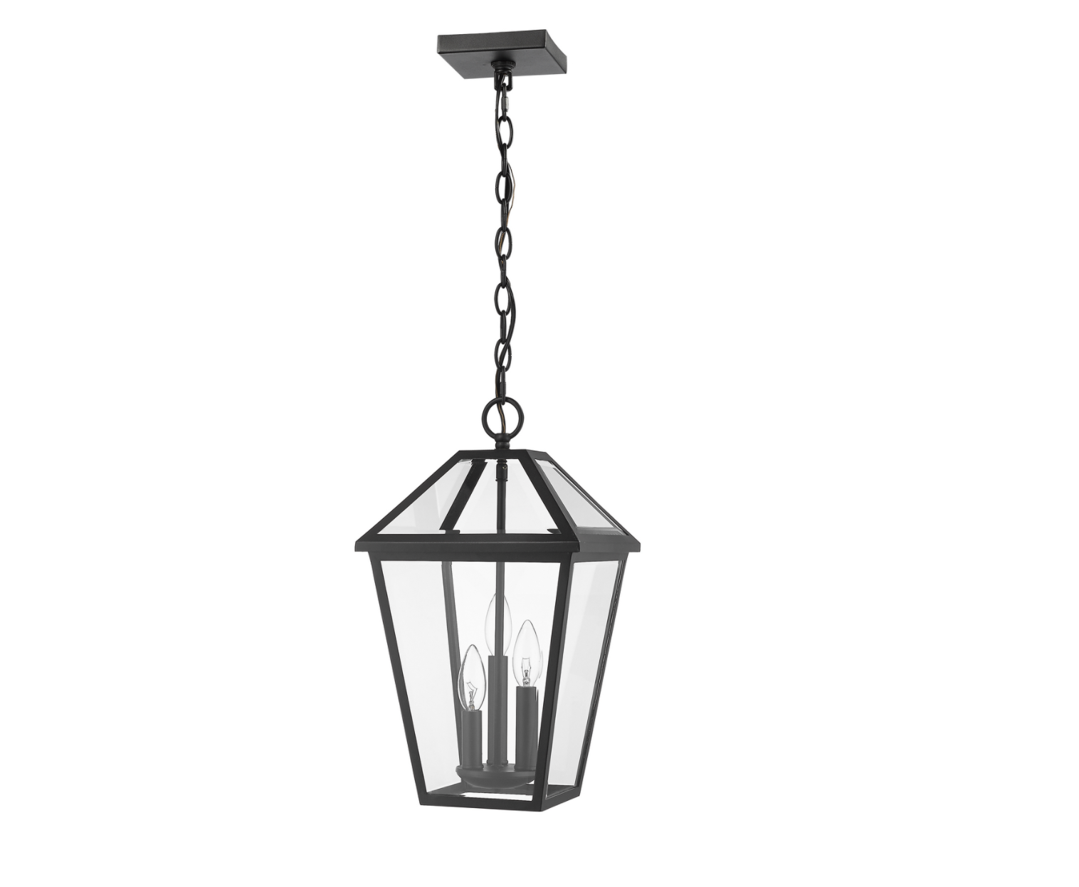 Illuminate an exterior front or back yard space with a classic fixture reflecting a charming village theme. Made from Midnight Black metal and clear beveled glass panels, this three-light outdoor chain mount ceiling light brings a design-forward look to wrap up a tasteful and functional patio or porch space.