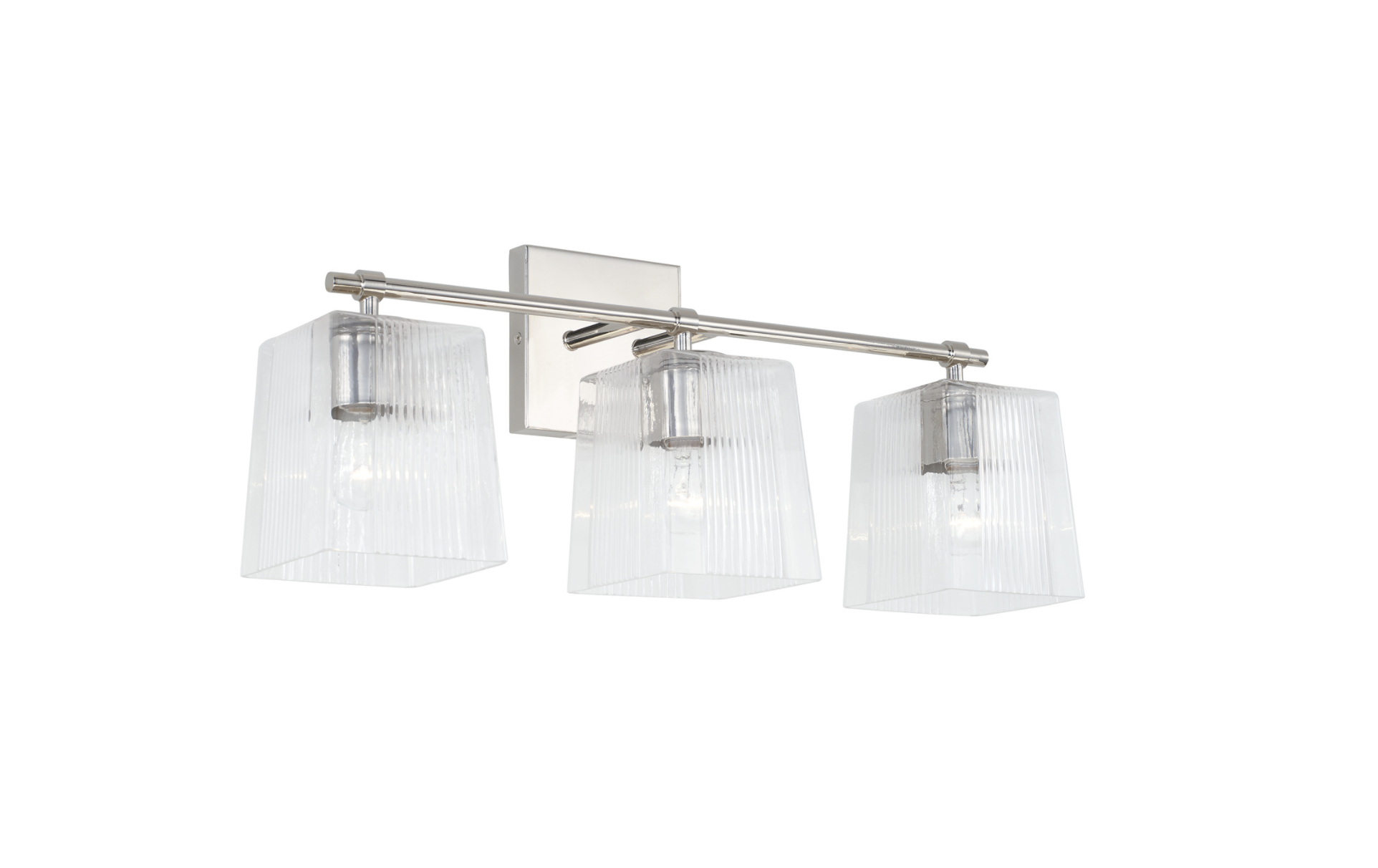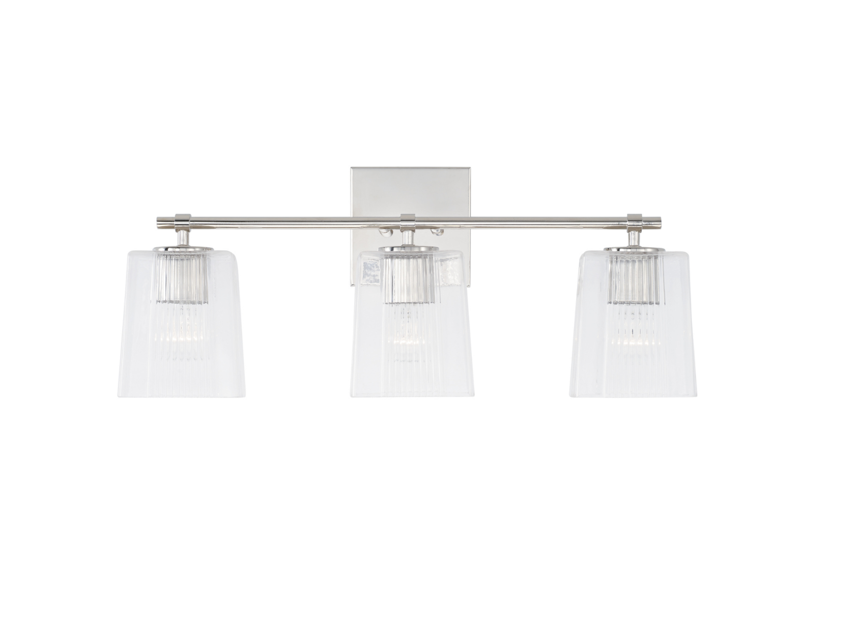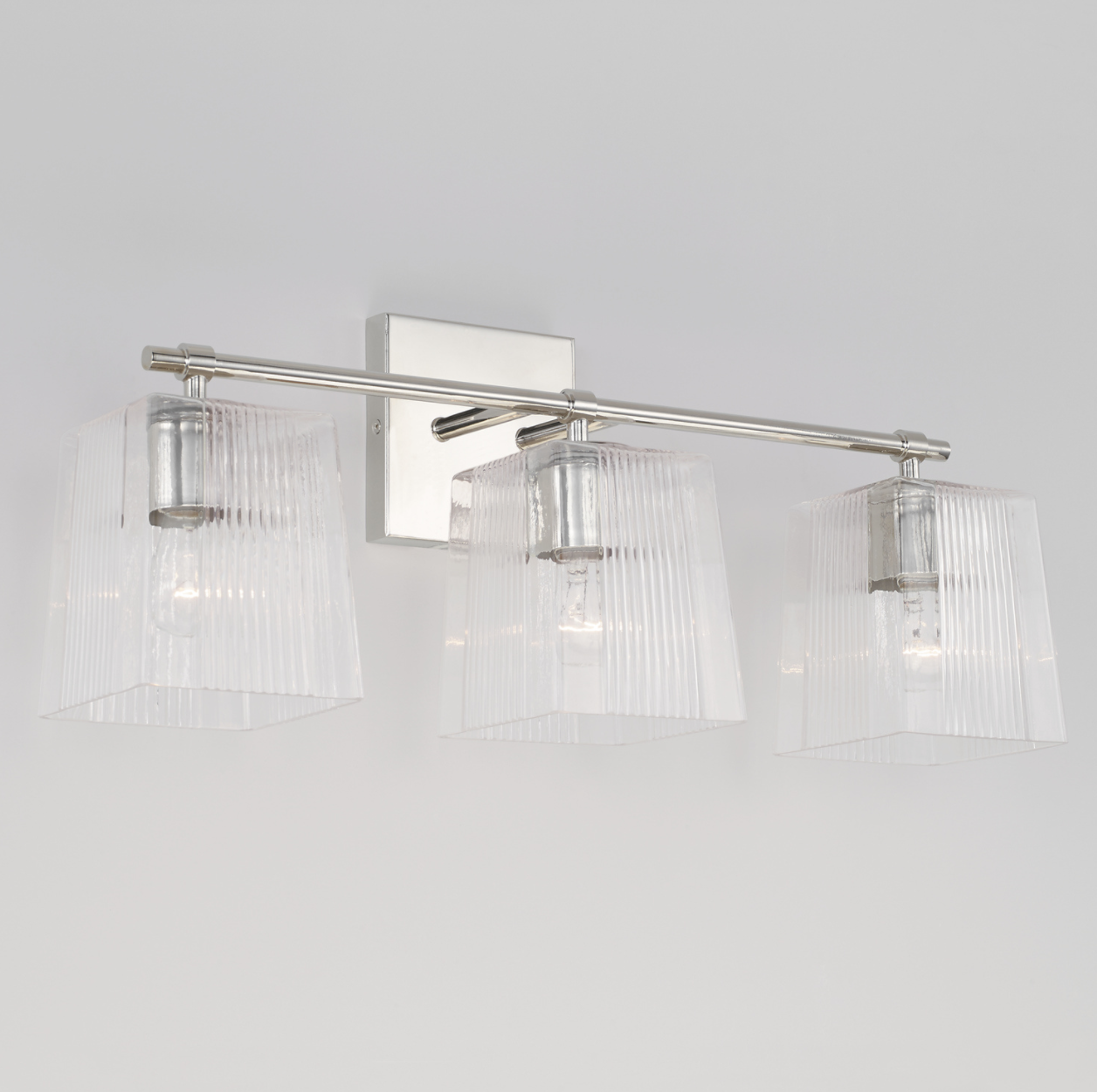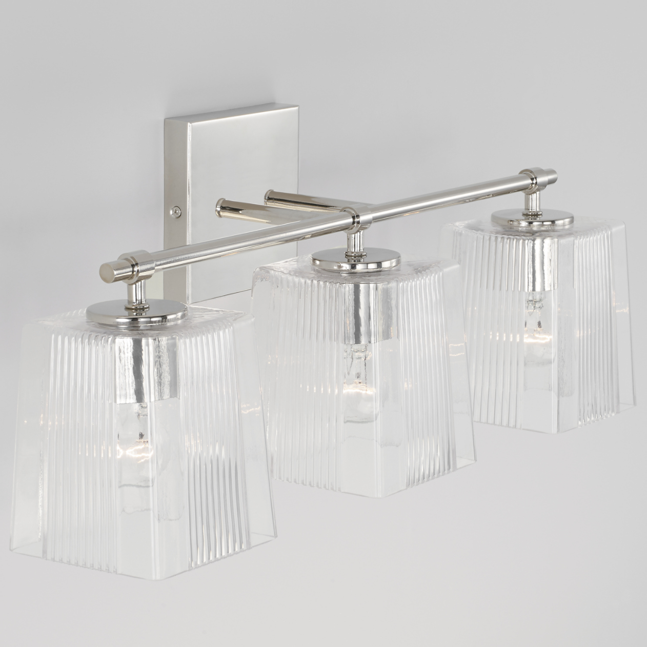 The chic fluted details on the Sandra 3-Light Vanity create character and visual interest. The tapered glass silhouette accented by the polished Nickel finish adds a stunning yet simple sparkle to any space.