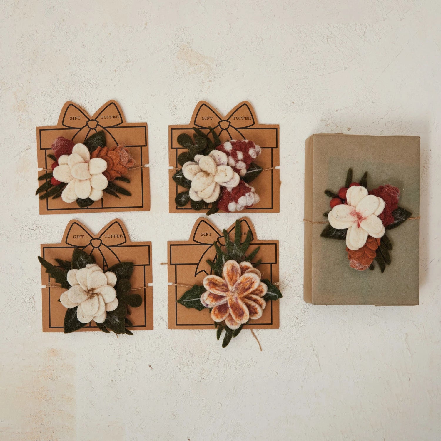This wool felt flower gift topper with jute wrap is a lovely and soft way to decorate gifts or crafts. The gift topper features a wool felt flower with a jute wrap that gives it a rustic and natural look. The gift topper is made of wool felt with a jute string, and handcrafted with care. The gift topper is ideal for topping off gift boxes, baskets, bags, or jars, or for making own flower arrangements, bouquets, or corsages. Use the jute wrap to tie it to gift or project, or to create a bow or a loop. The gift topper measures 5 inches in length, 1 inch in width, and 4 inches in height, and comes in 4 different styles and colors to choose from. A lovely and soft gift topper that features a wool felt flower with a jute wrap. A charming choice for adding some texture and color to gift wrapping or craft projects. Ideal for topping off gift boxes, baskets, bags, or jars, or for making own flower arrangements, bouquets, or corsages.
