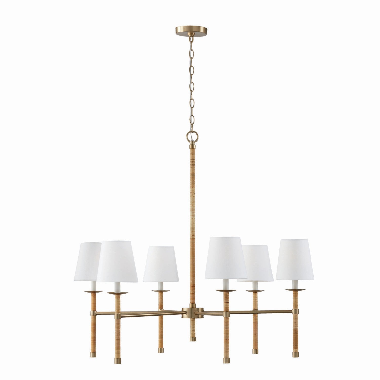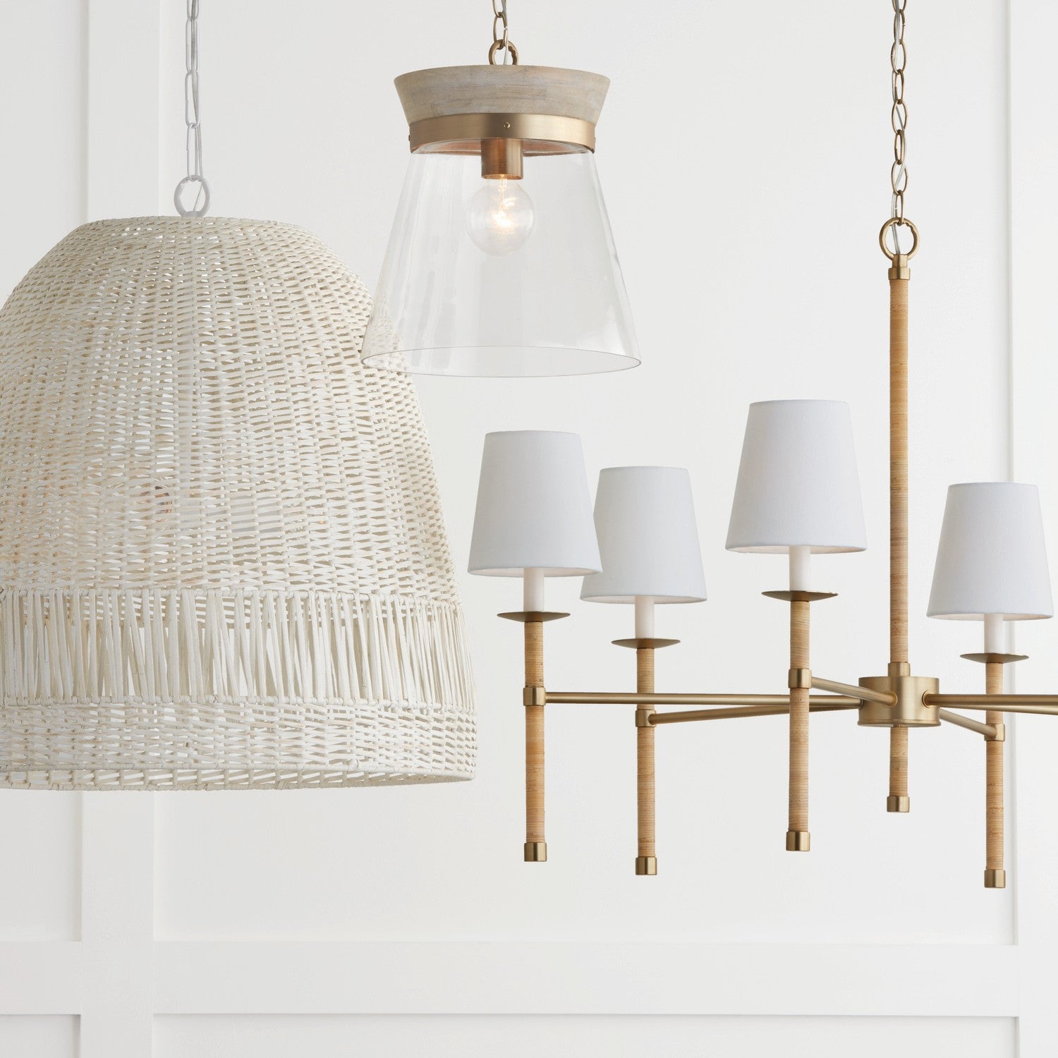 The Cabo Chandelier creates a new look on natural style. The handwrapped rattan on elongated arms pairs perfectly with crisp, white shades and hints of Matte Brass to bring bohemian chic to any space.