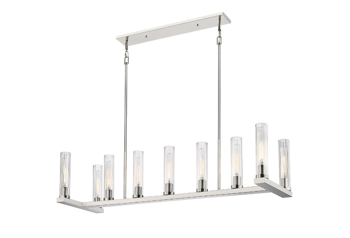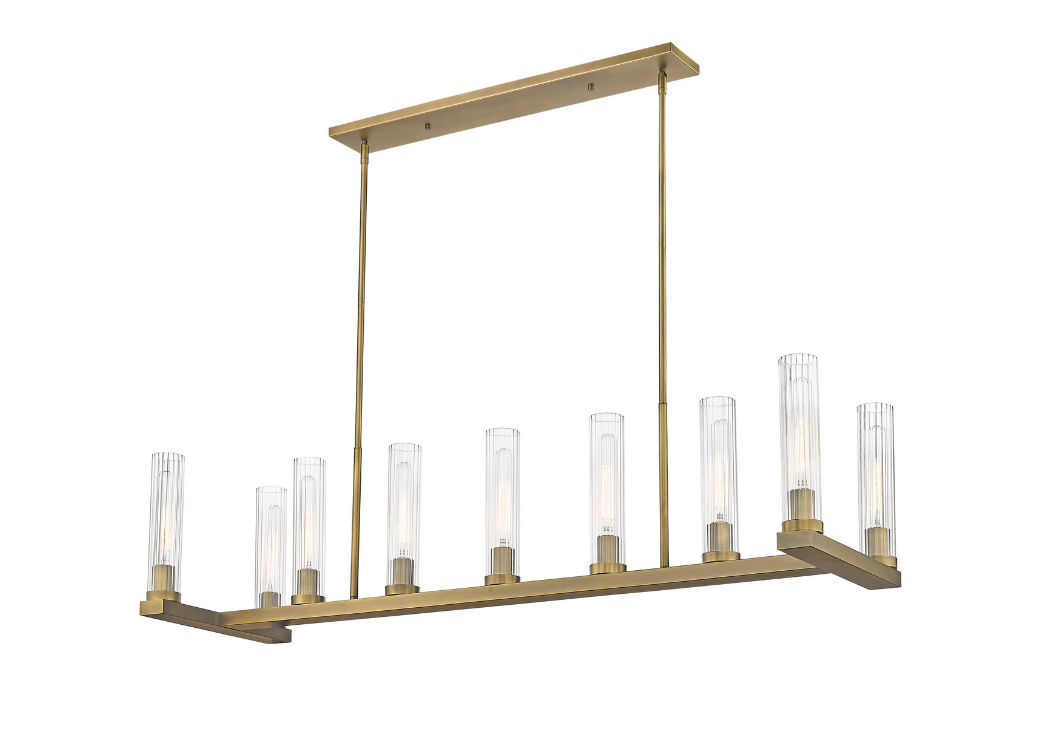 Suspend this stylish, metal island light over a pool table or kitchen island for inviting ambiance and elegant, modern flair. This stately fixture features a rich rubbed brass finish and nine textured glass shades for a sophisticated look.