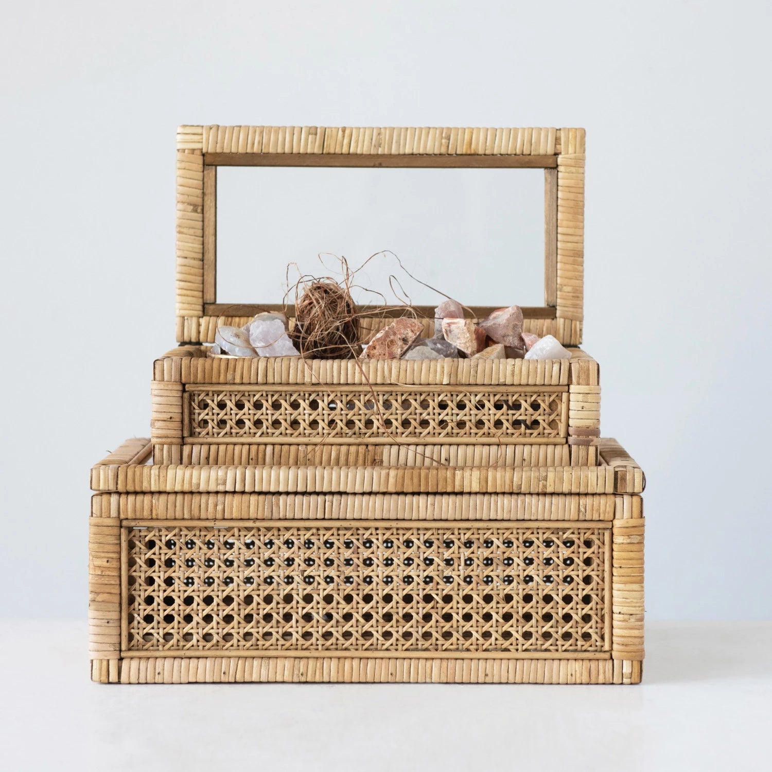Woven Rattan & Wood Display Boxes w/ Glass Lids, Natural,
