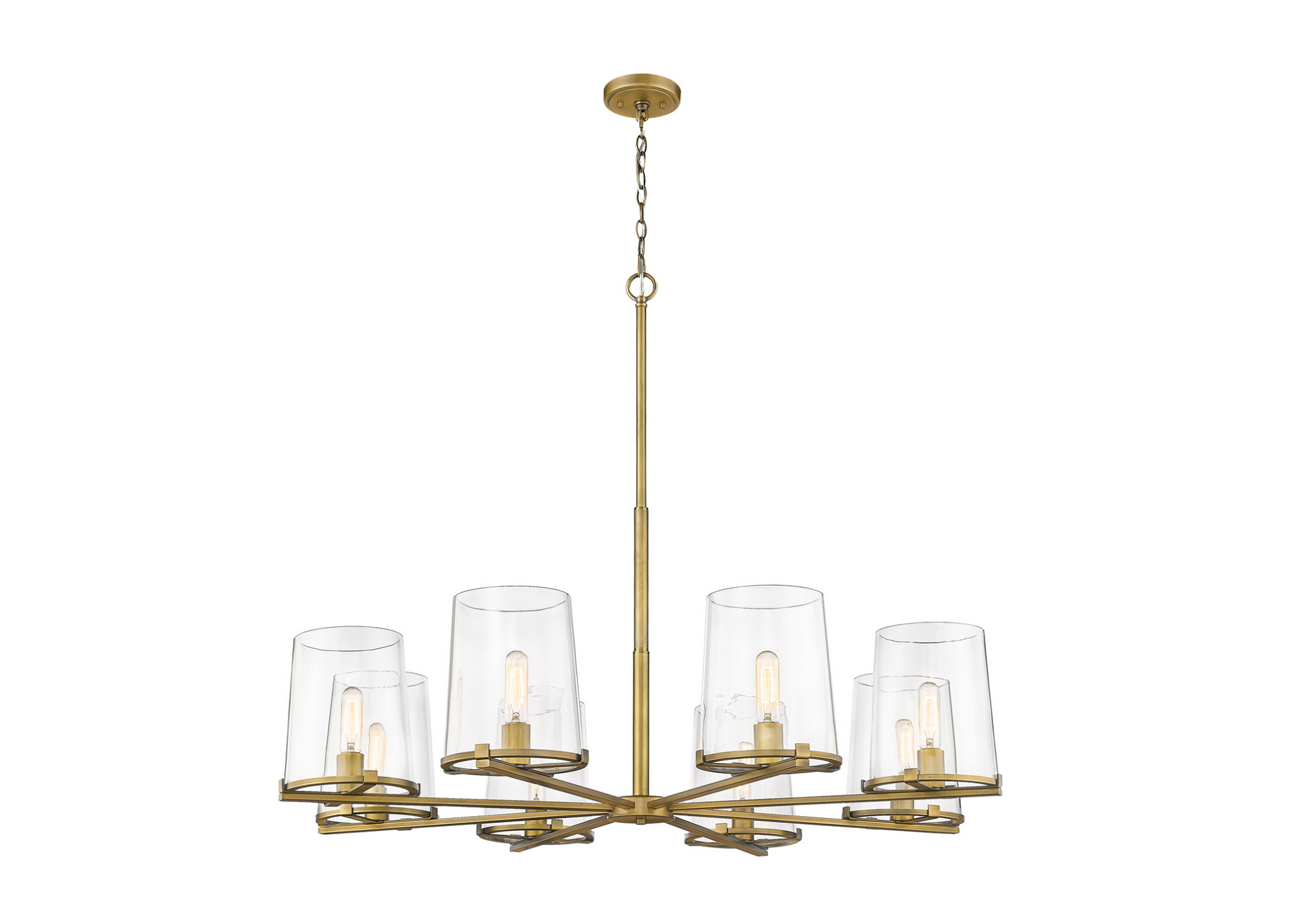Create a warm and inviting dining room atmosphere with this eight-light metal chandelier. Eight tasteful, clear glass shades allow for bright illumination as the classic, rubbed brass finish shines in the light .