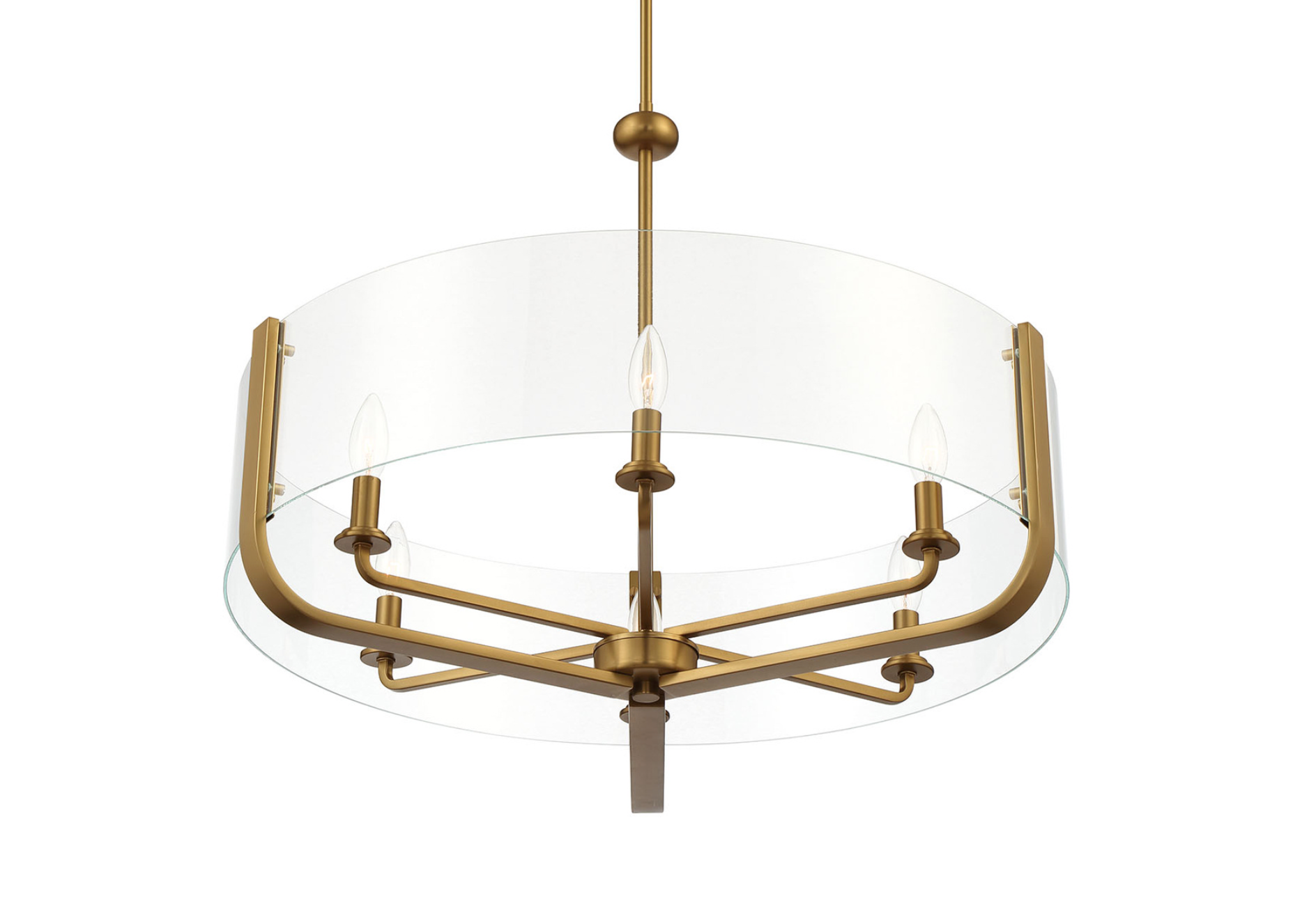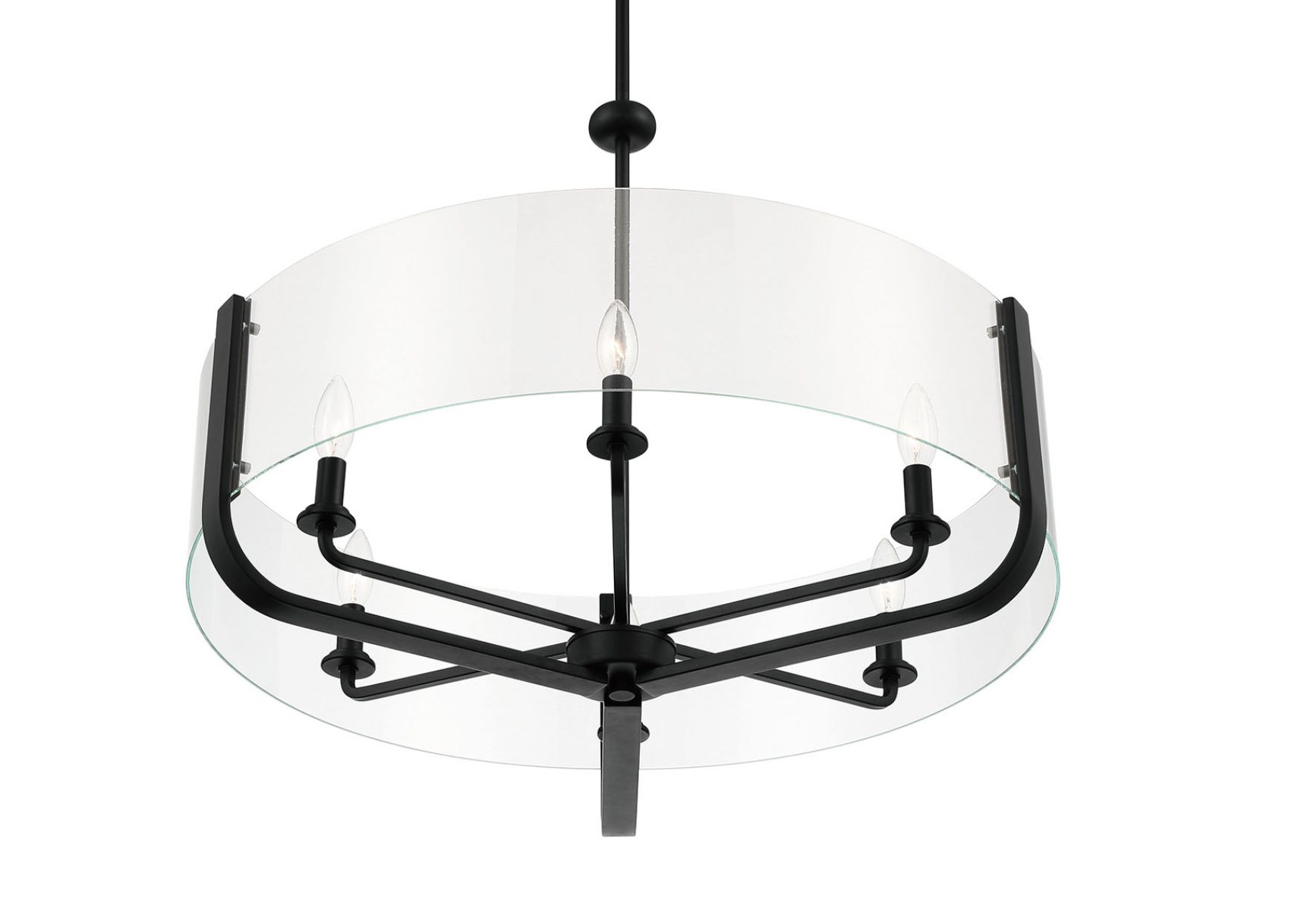 Hand-blown clear glass is seamlessly suspended by a simple frame, highlighting the charm of a candelabra in this transitional piece.