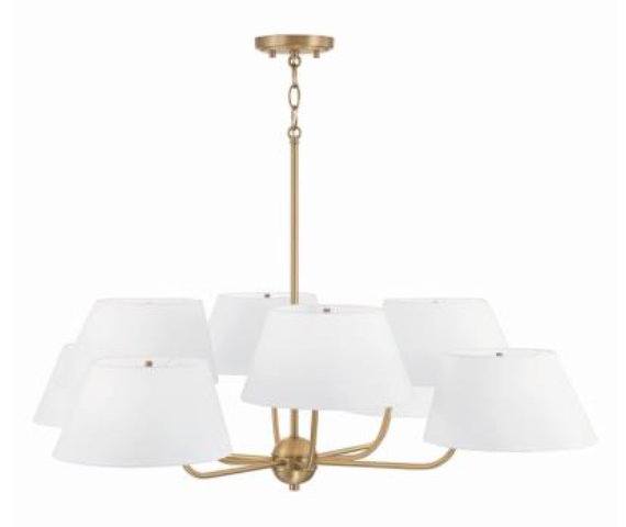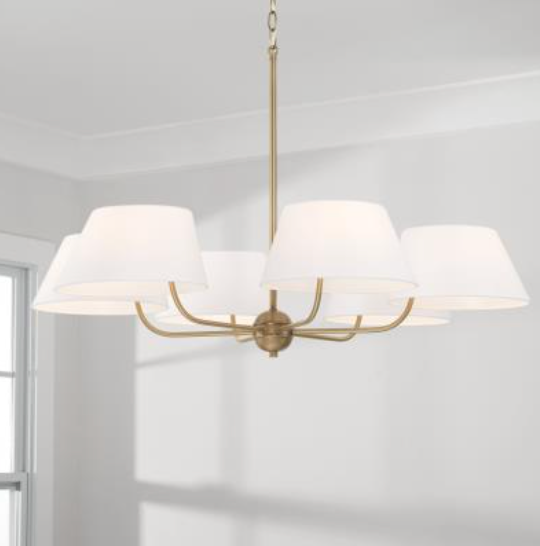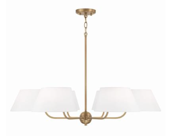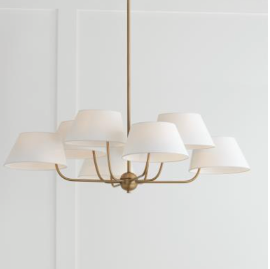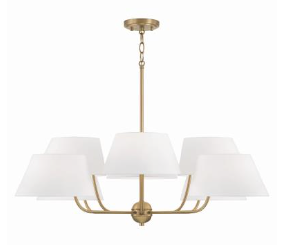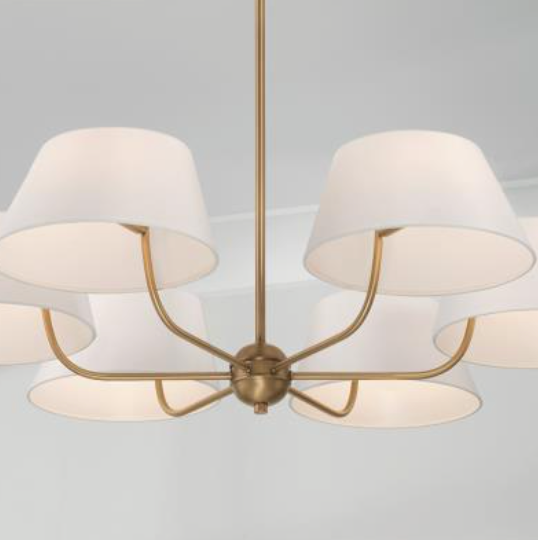 Angled shades create the ultimate sophistication with the Lilah Chandelier. The crisp white fabric drum shades get a geometric refresh and complement the warmth of the slender Aged Brass arms.