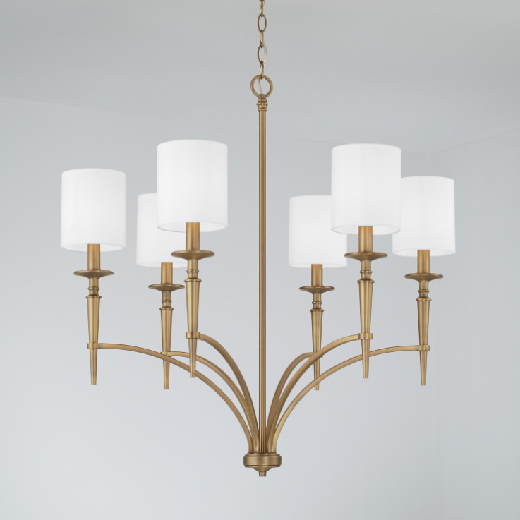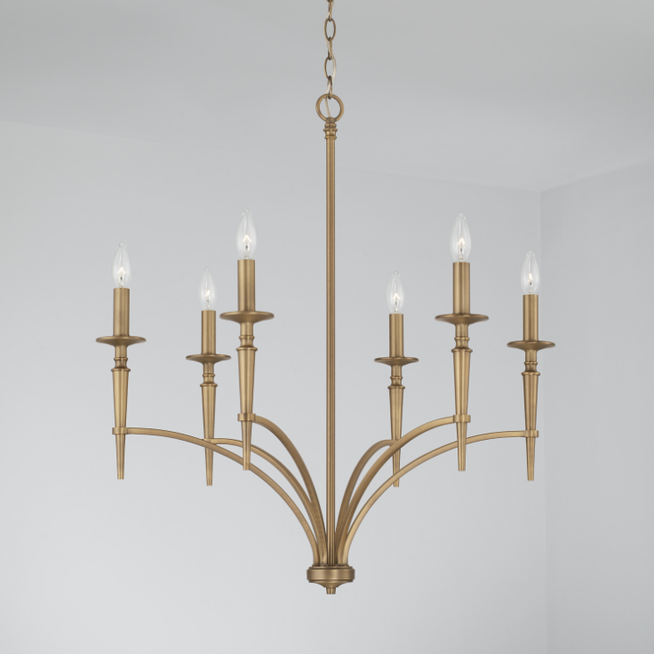 Straight edges and striking curves add layers of drama to the London 6-Light Chandelier. The candlestick detailing in Aged Brass brings a glamourous nod to this updated design.