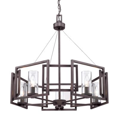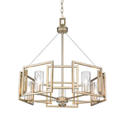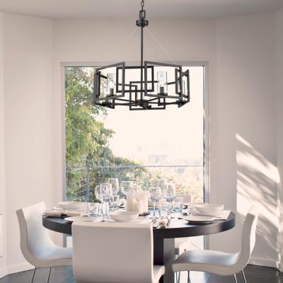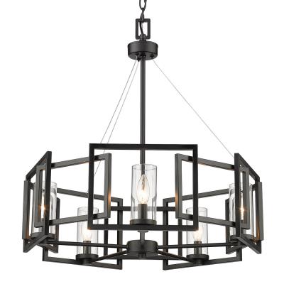 Sleek angles and a geometric form make an ultra-modern statement in the Mallory Collection. The series is offered in multiple finishes that heighten the light airy look. Clear Glass cylinders surround the stately silhouettes of candelabra bulbs. This 5-light chandelier creates a stylish focal point and is comfortably sized for intimate dining and living areas.
