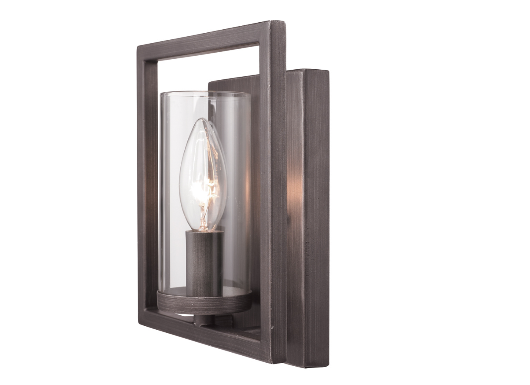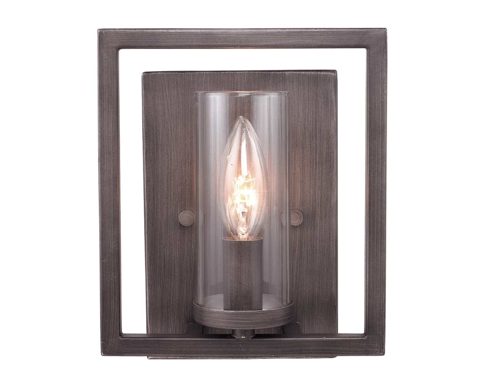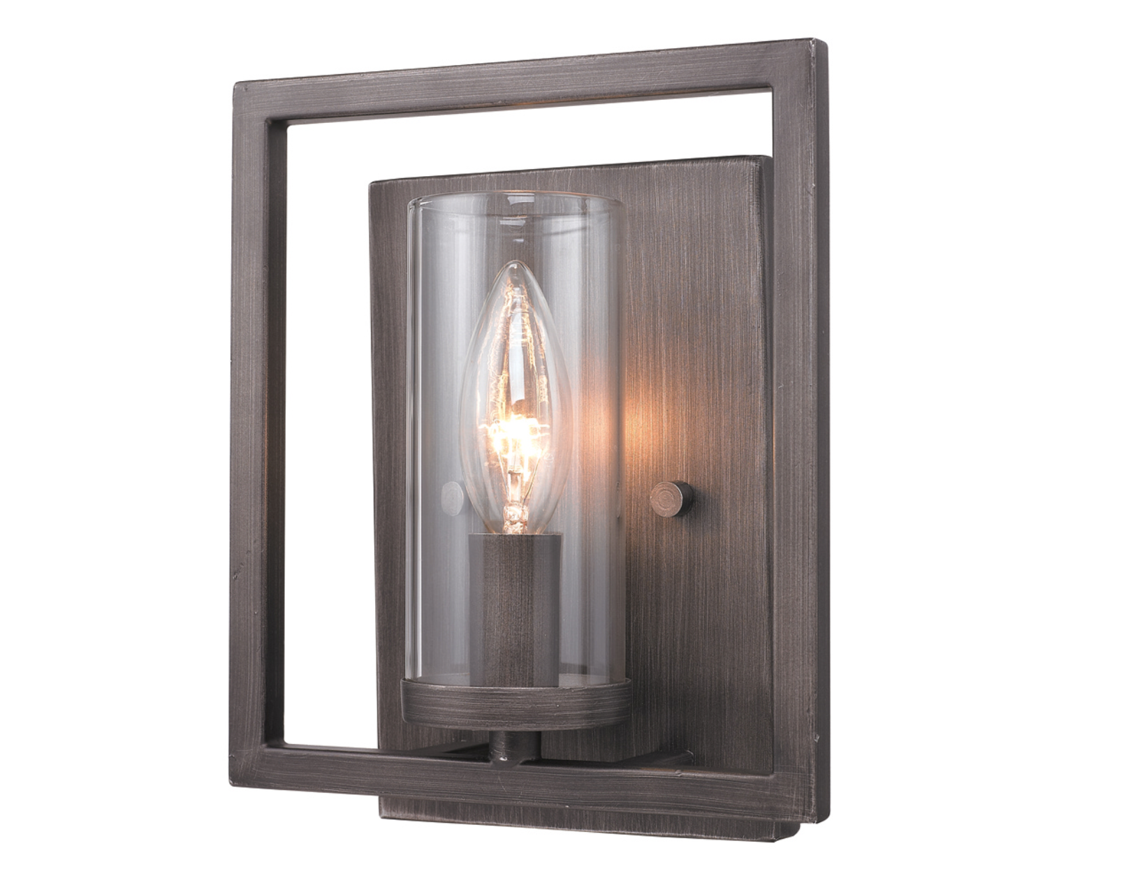 Sleek angles and a geometric form make an ultra-modern statement in the Mallory collection. The series is offered in multiple finishes that heighten the light airy look. Clear Glass cylinders surround the stately silhouettes of candelabra bulbs. This sconce can be used in a hall, stairway, or foyer as an accent. It can be hung individually or as a pair.