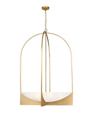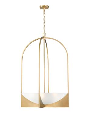 A sophisticated modern gold finish offers a stylish touch to this four-light pendant light with an open version of sculptural artisan aesthetics. An elliptical frame contains a glam-inspired waterglass bowl acting as a subtle diffuser, diminishing glare and creating soft lighting for foyers, dining spaces, bedrooms, and hallways. This fixture is a perfect mix of contemporary and transitional design aesthetics.