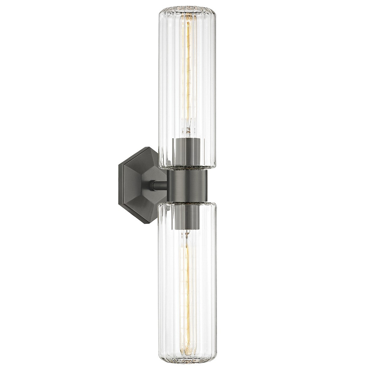 Decorative faceting and fluted glass give the Rosie sconce its distinctive graphic appeal. One or two tube shades extend from a central holder, creating an elevated version of an everyday staple. The unexpected focal point is the backplate, which has been faceted like a gem. Rosie is available in Aged Brass, Old Bronze, or Polished Nickel finishes.