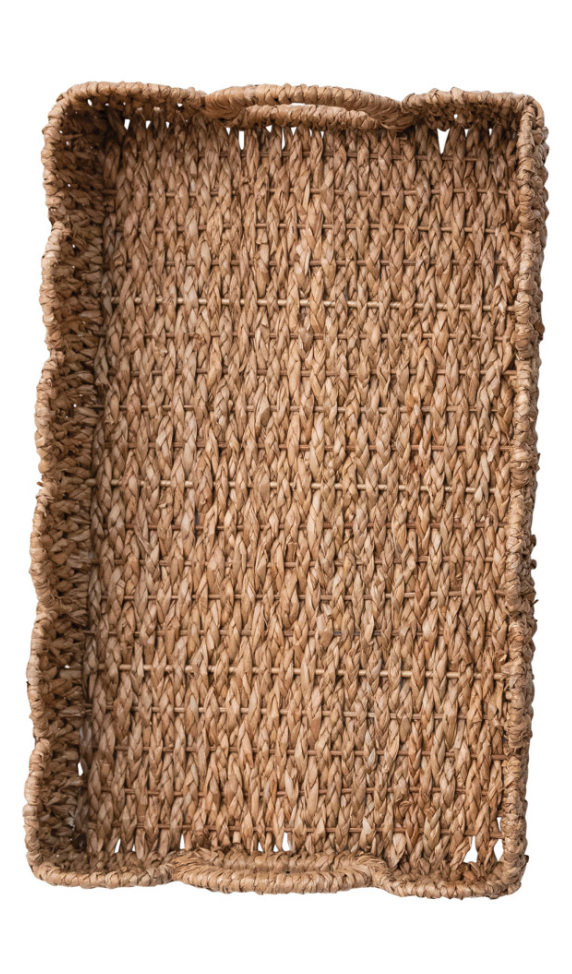 These bankuan trays with handles add natural elegance and functionality to any home. They are handcrafted from natural bankuan, a type of grass that grows in the Philippines. The trays have a rectangular shape and a woven design that creates a sophisticated and refined look. They can serve guests, organize belongings, or decorate space, bringing a touch of farmhouse, boho, French country, coastal, or lodge style to any home. The set includes three different sizes of trays that can nest inside each other when not in use. They are a perfect way to add texture and warmth to any space.