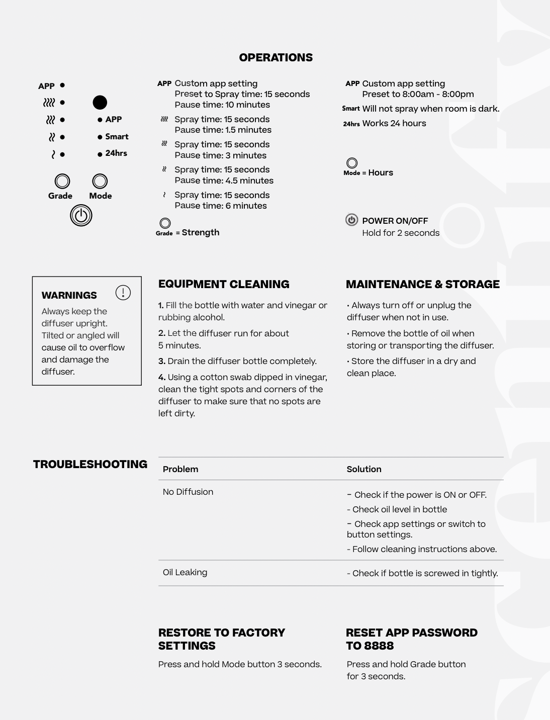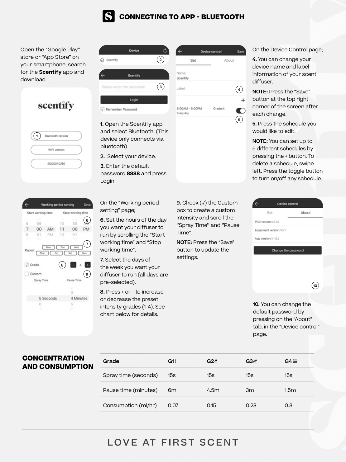 - The diffuser can be controlled via buttons on the device, or via Bluetooth with the Scentify App. With Bluetooth connectivity you can easily customize the strength, and your preferred hours and days.