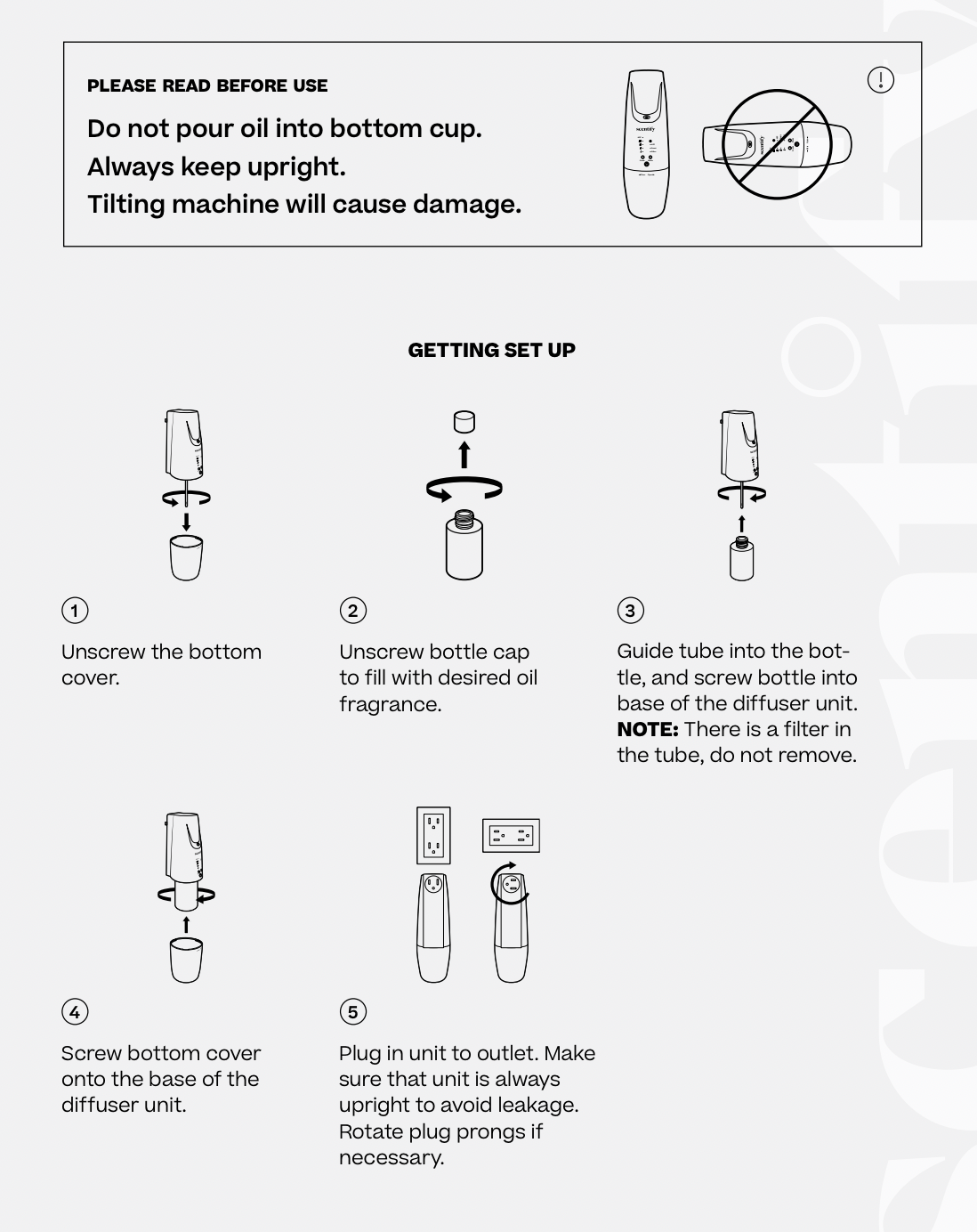 - The diffuser's enhanced leak protection ensures that it will remain functional, even if it is momentarily tipped over.