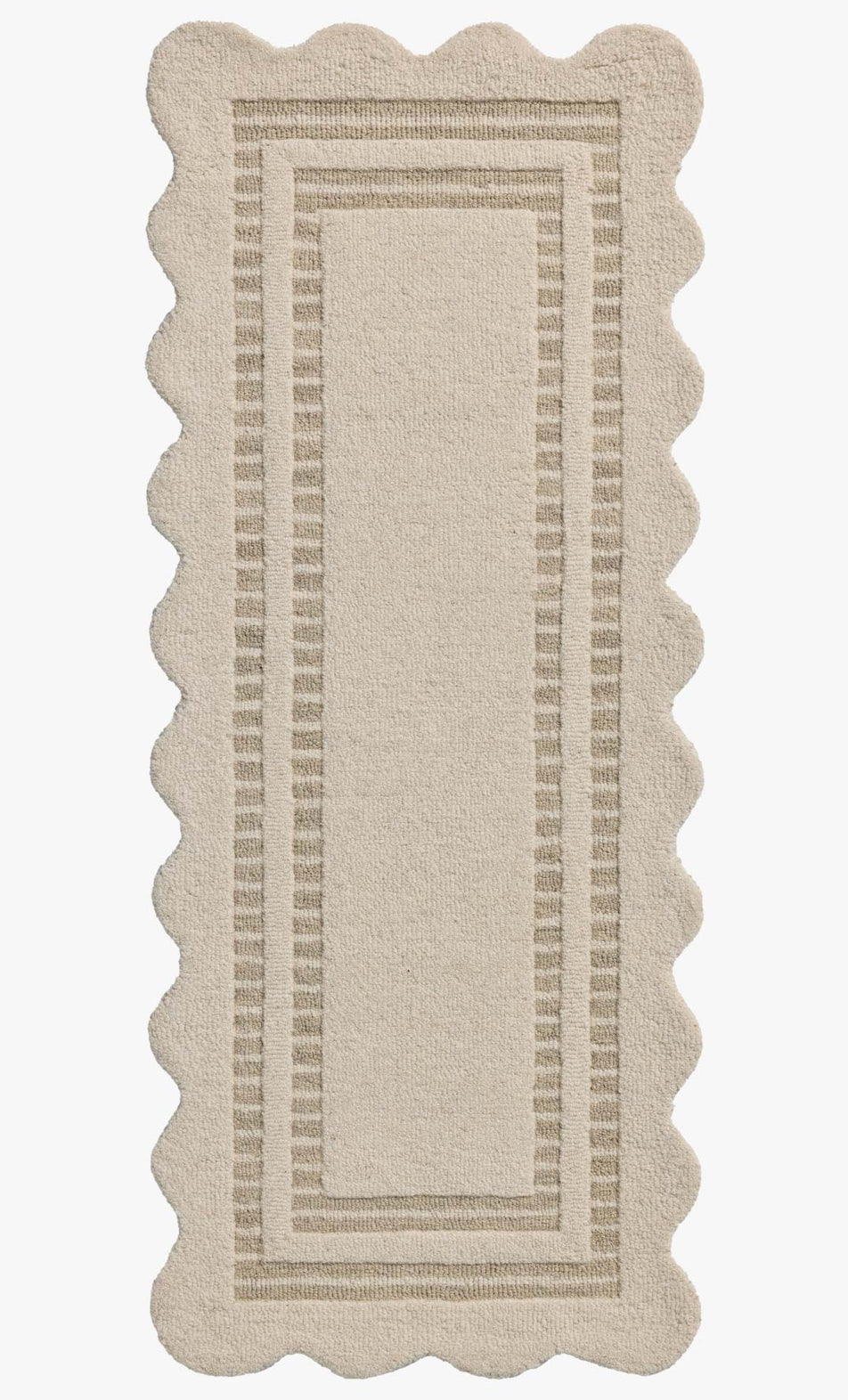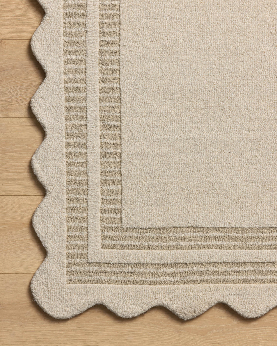 The Scottie Collection, designed by Chris Loves Julia, is a hand-tufted wool area rug with a playful scalloped edge and lower-pile, striped border for a touch of structure. The rugs overall pile is thick and plush, available in easygoing earth tones and neutral colorways. This collection is hand-tufted of 100% wool in India and Goodweave-certified, ensuring our commitment to ethical production and the support of weavers communities. Some shedding is expected and a natural characteristic of wool rugs; we recommend vacuuming frequently without a beater bar.