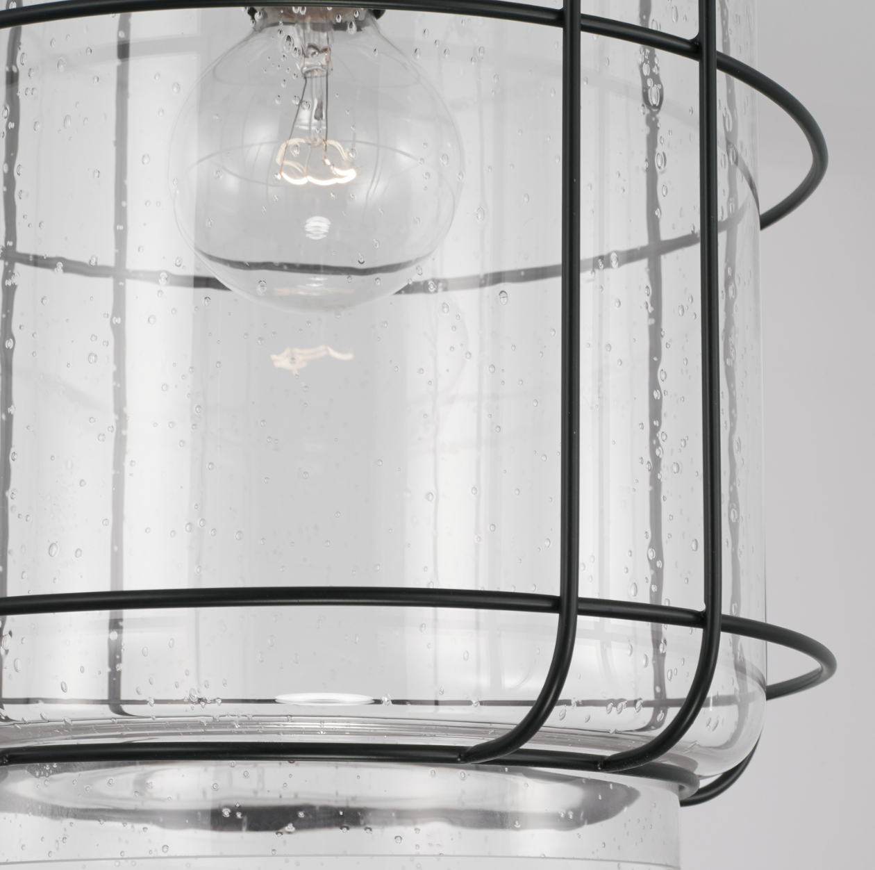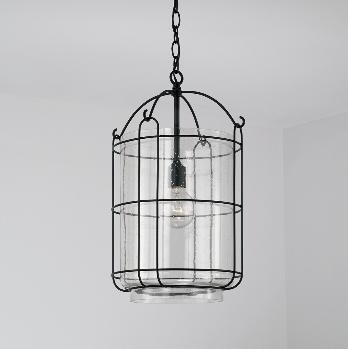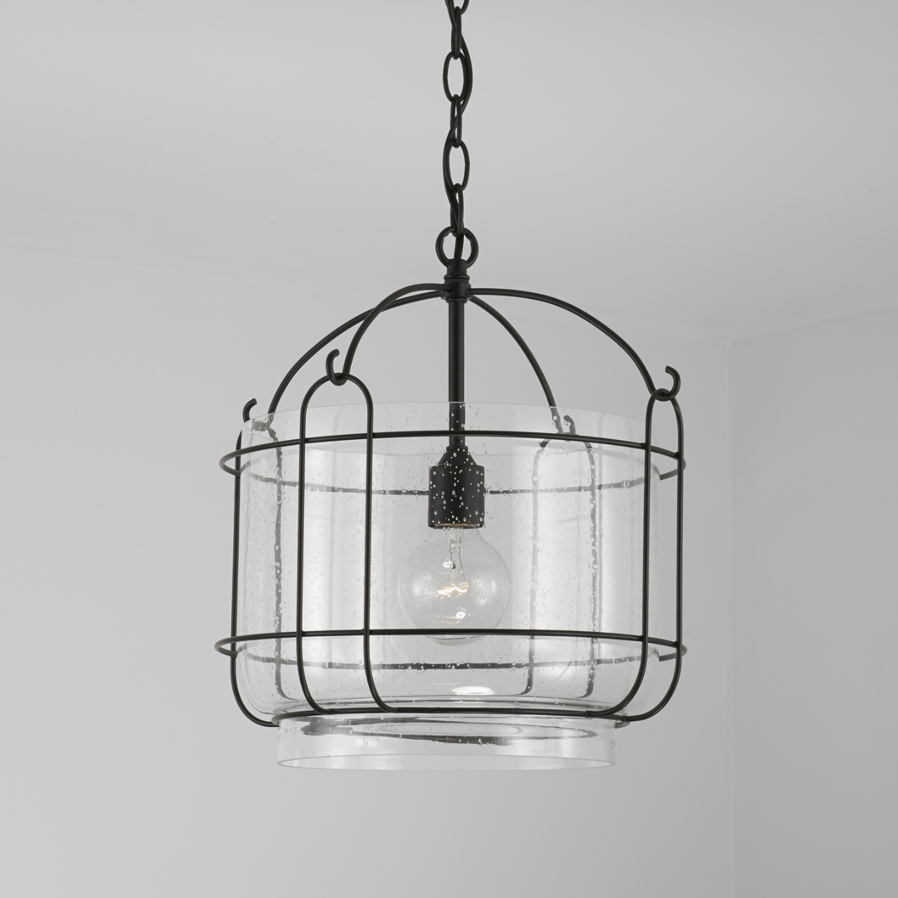 Inspired by a vintage walking lantern, the Turner 1-Light Pendant evokes farmhouse flair. The seeded glass shade complements the classic Matte Black finish on the cage silhouette for a style that will stand the test of time.
