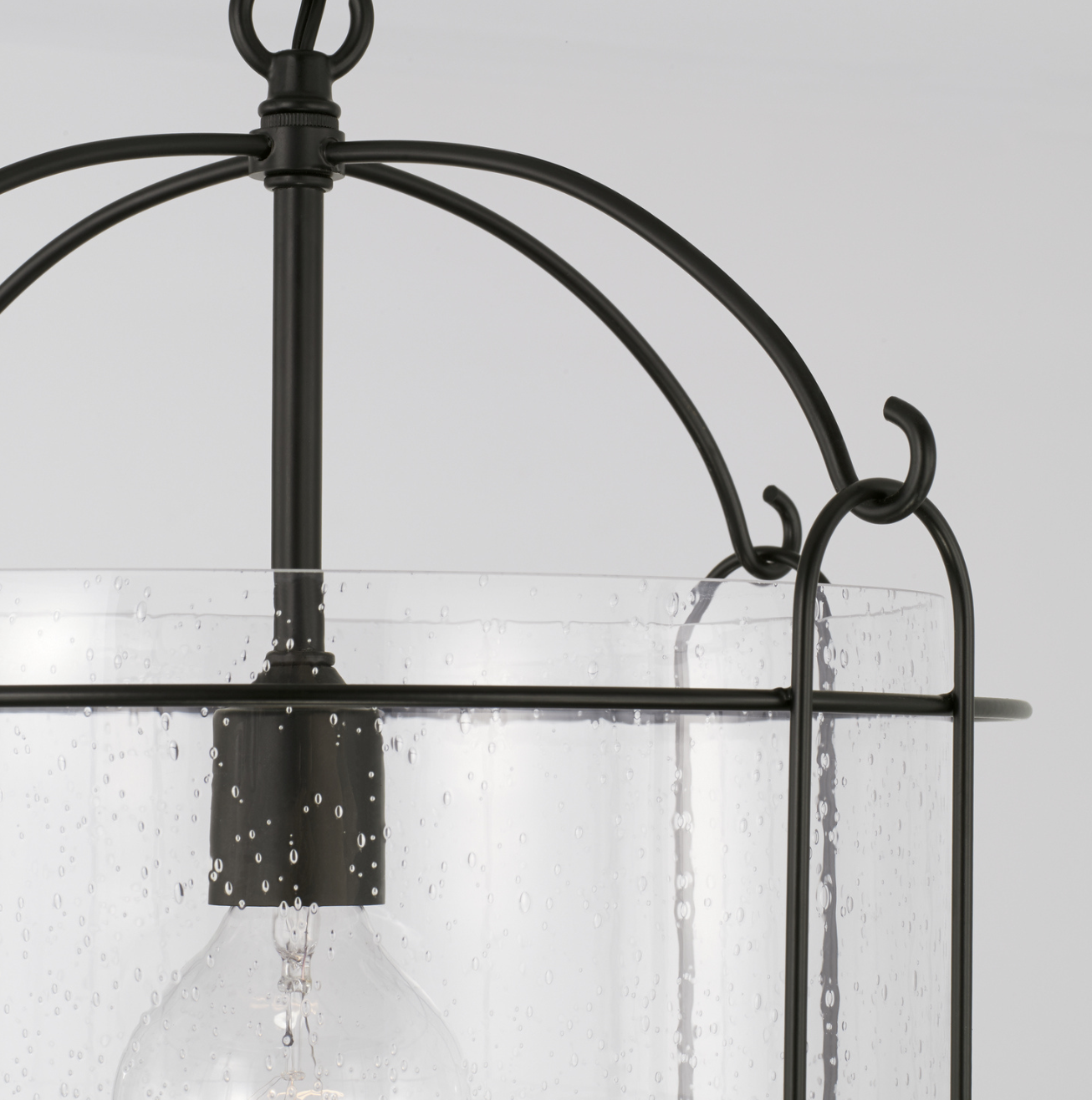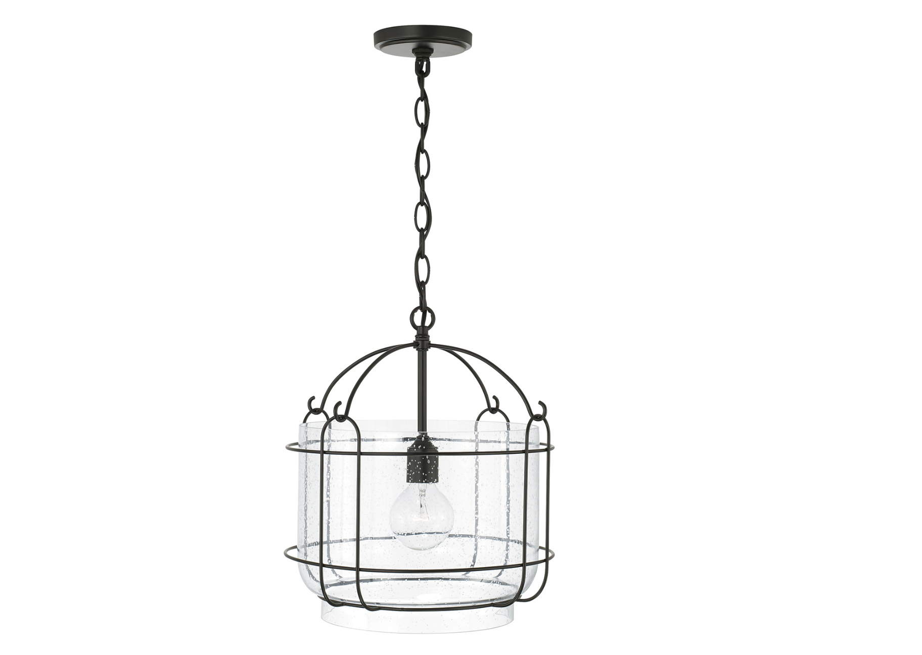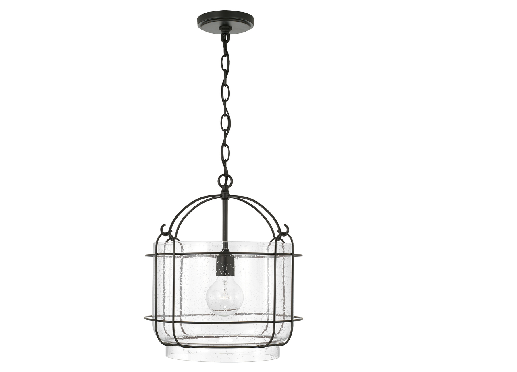 Inspired by a vintage walking lantern, the Turner 1-Light Pendant evokes farmhouse flair. The seeded glass shade complements the classic Matte Black finish on the cage silhouette for a style that will stand the test of time.